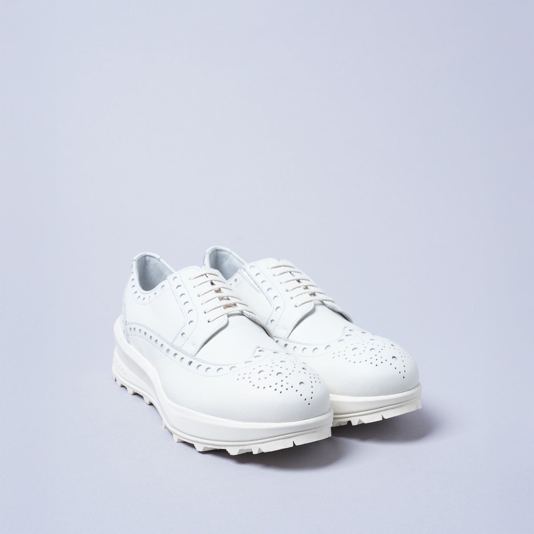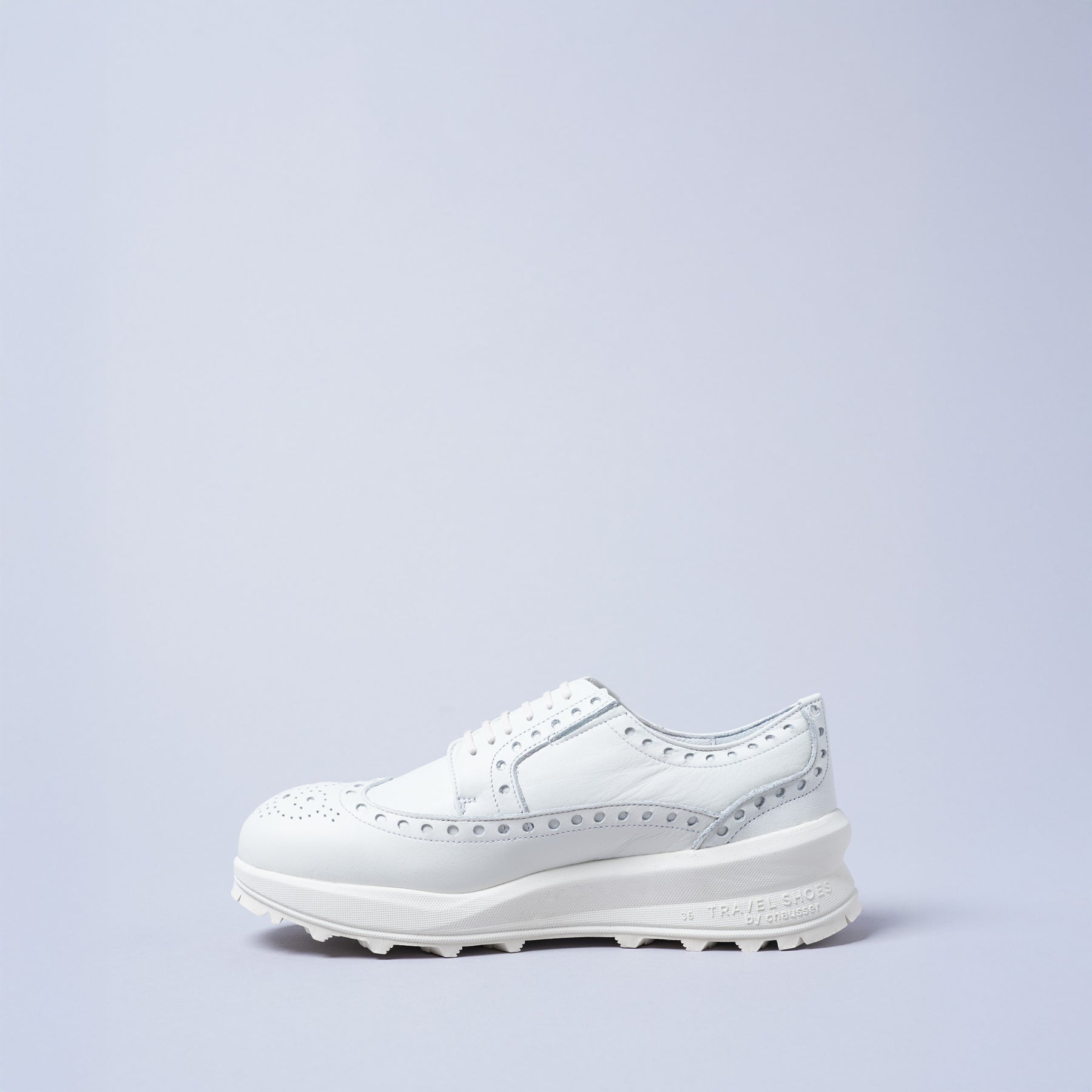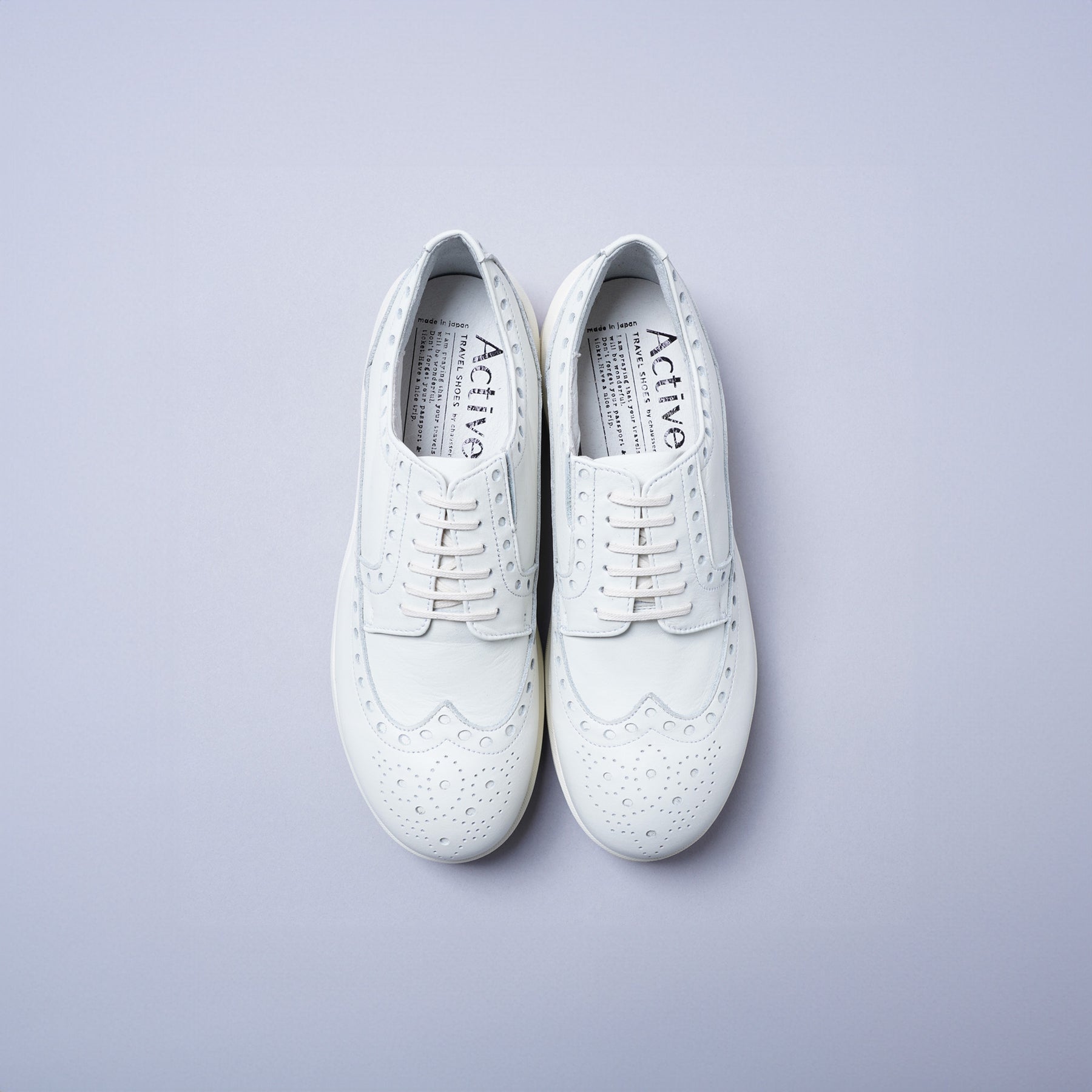 Active TRAVEL SHOES' wingtip shoes feature evenly spaced round perforations that express a distinctly masculine vibe. All Active styles incorporate padding at the collar for comfortable support during extended wear. Additionally, elastic inserts in the inner vamp slits allow for easy on/off without untying laces. As a travel-themed series, TRAVEL SHOES includes a convenient shoe bag for carrying them to your destination. The leather used features a soft texture, achieved by embedding fluororesin into the fibers during dyeing and applying a water-repellent finish to the surface. It repels water while allowing airflow, maintaining breathability.