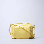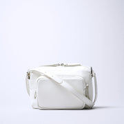 This compact shoulder bag is popular for its just-right size. The front pocket holds frequently used items like your smartphone or handkerchief. A zippered pocket is also located on the back. It's a very practical shoulder bag for travel, where you often need to retrieve items like tickets. The adjustable shoulder strap on both sides provides ample length even over winter coats. You can use it year-round. The main compartment fits a long wallet. Available in four colors: black, white, ivory, and yellow. The black version is made from full-grain tanned cowhide leather with a textured grain, while the other three colors are smooth cowhide leather. Its unisex design makes it perfect for couples or matching looks.