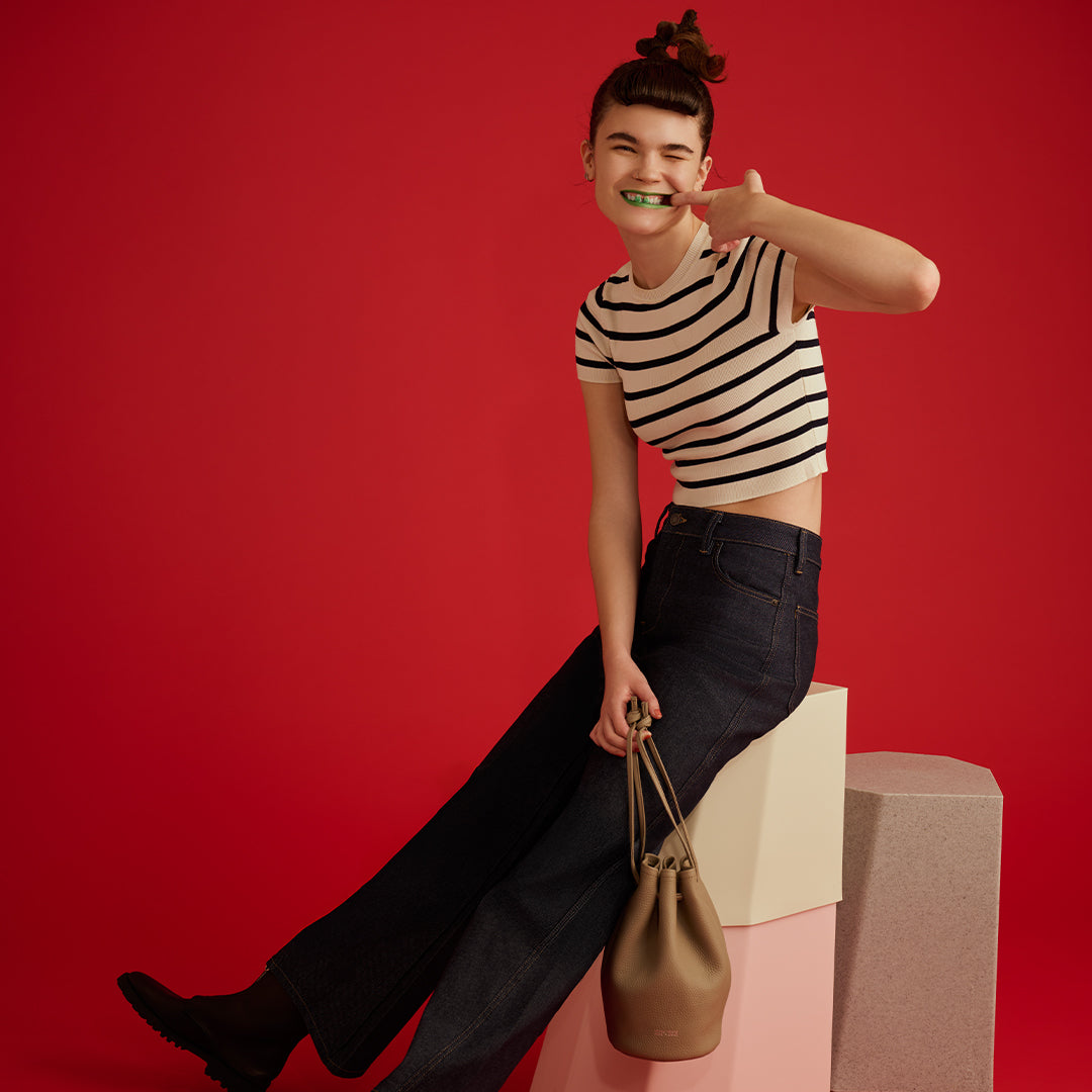 <LEZALI> Embossed Leather Drawstring Mini Bag / Taupe