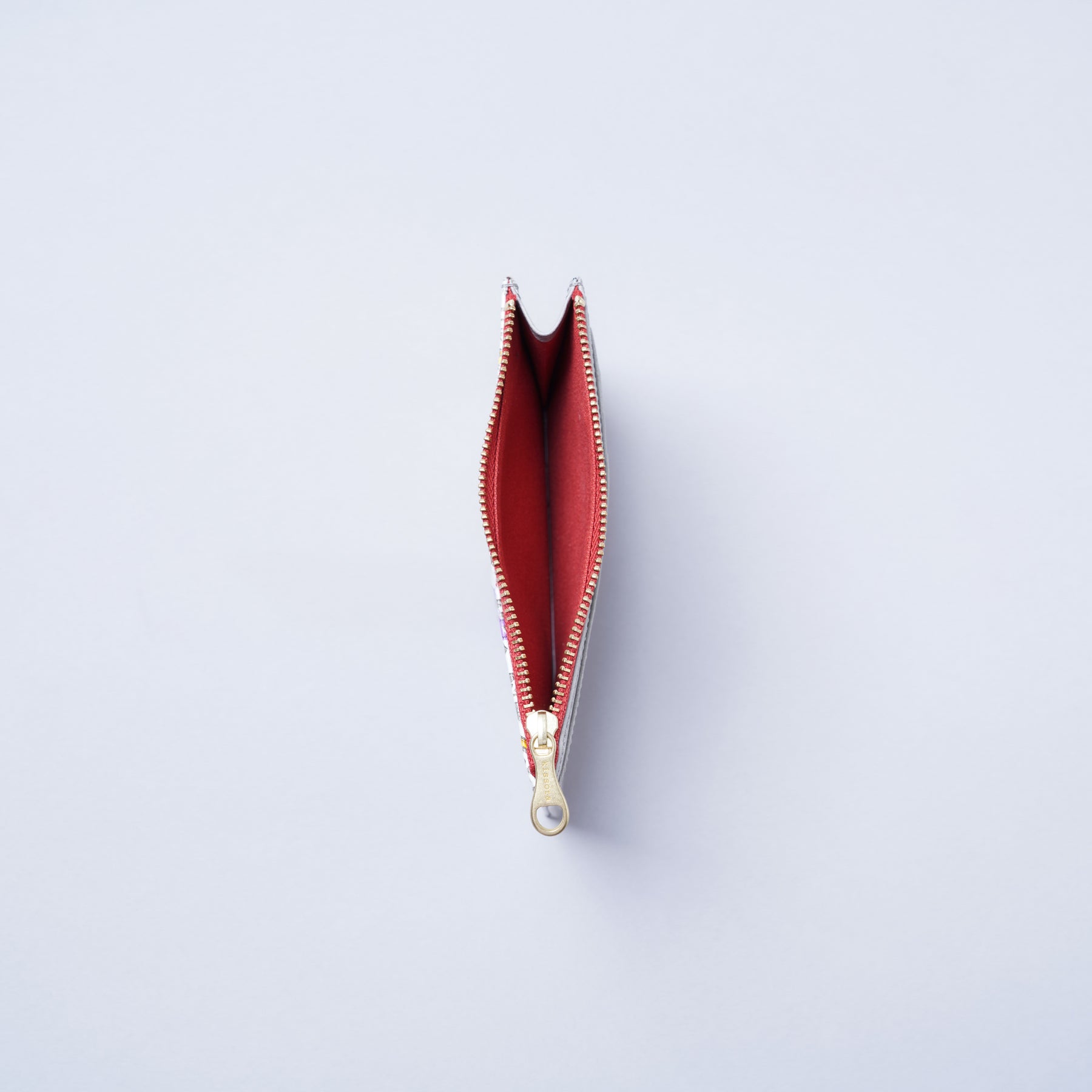 純白の本革をベースに伝統工芸士の指導の下、熟練された職人によって染め上げられた繊細で鮮やかな文庫革を使用した本アイテム。白い革に施された繊細な模様が美しく、型押しによってできる凹凸は光の反射できらきらと存在感を醸し出します。文庫革は、真っ白な牛革を使用し、独特な加工を施した工芸品を指します。