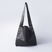 The “Shopping Bag L” is a one-shoulder bag designed in the motif of a plastic shopping bag, a product that is familiar to our daily lives. Because of its size and presence, it is a fun bag to style as part of your outfit. It is a size preferred by men as well, but the balance of the bag when worn by a woman is also wonderful. The sturdy Hallie's fabric makes it ideal for carrying heavy books or a laptop to work or school. The stitching line in the center of the bag, which brings the overall bag together, also serves as a subtle reinforcement. The shoulder strap is wide to reduce the burden on the body when carrying the bag. It is just the right length to fit on a woman's body when worn across the body.