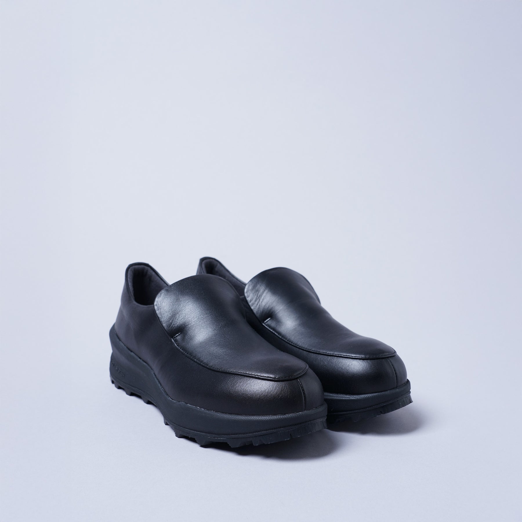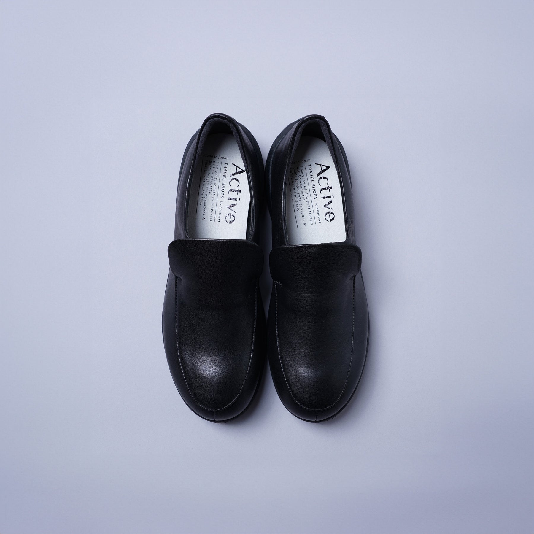 TRAVEL SHOES' slip on shoes have no laces or buckles making them easy to put on and take off. All Active styles incorporate padding at the collar for comfortable support during extended wear. As a travel-themed series, TRAVEL SHOES includes a convenient shoe bag for carrying them to your destination. The leather used features a soft texture, achieved by embedding fluororesin into the fibers during dyeing and applying a water-repellent finish to the surface. It repels water while allowing airflow, maintaining breathability.