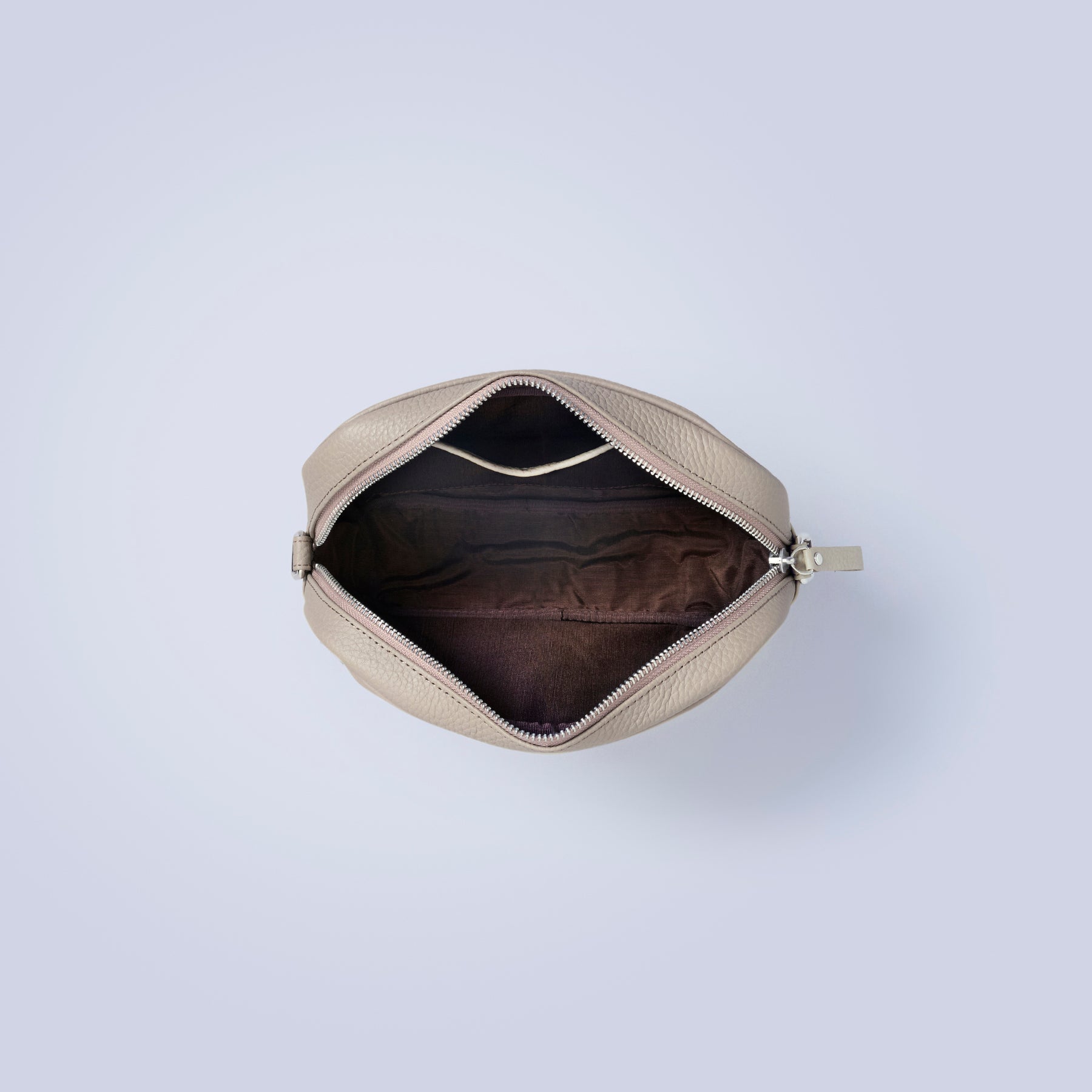 三方開きファスナーで中身が見やすく取り出しやすく、内装には手触りなめらかなブラウンのシャンタン生地を使用