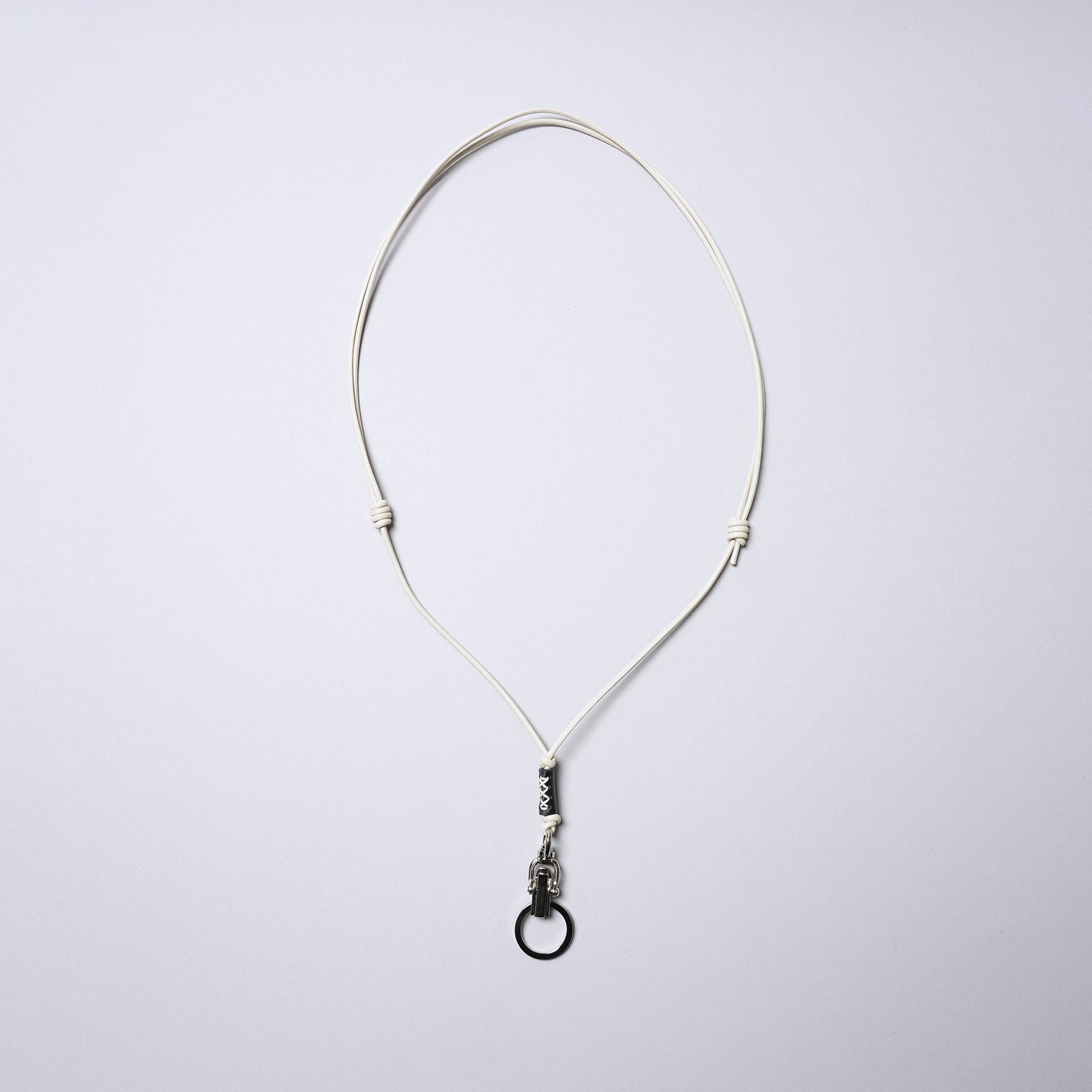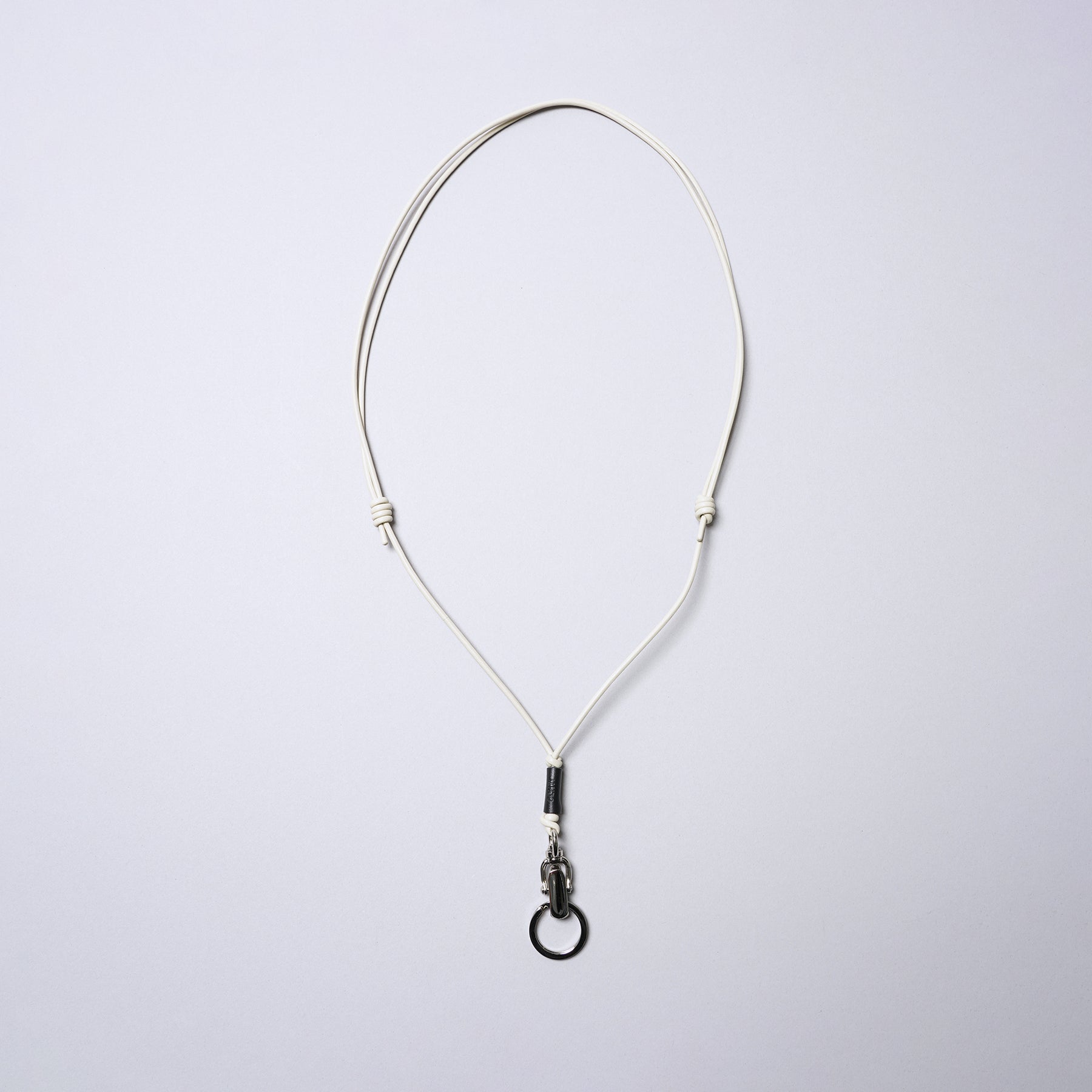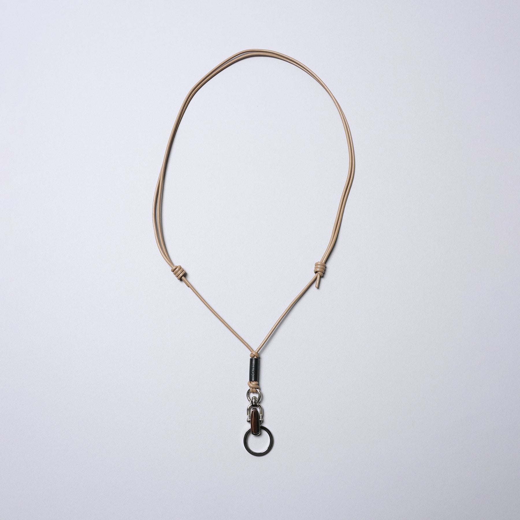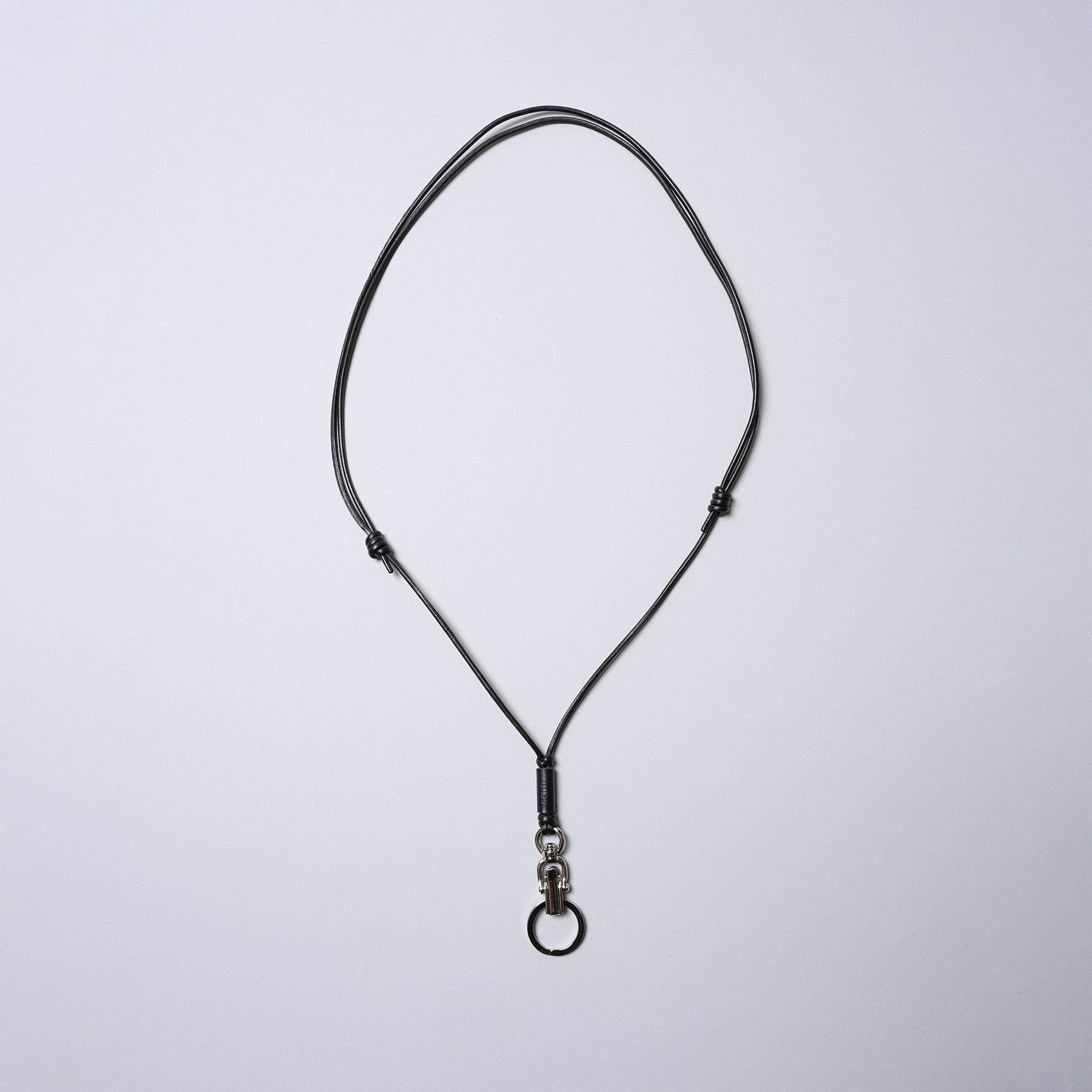 しなやかなレザーコードを使用、結び目をスライドさせることで長さ調整可(80cm~最長150cm程度/斜め掛け可能)