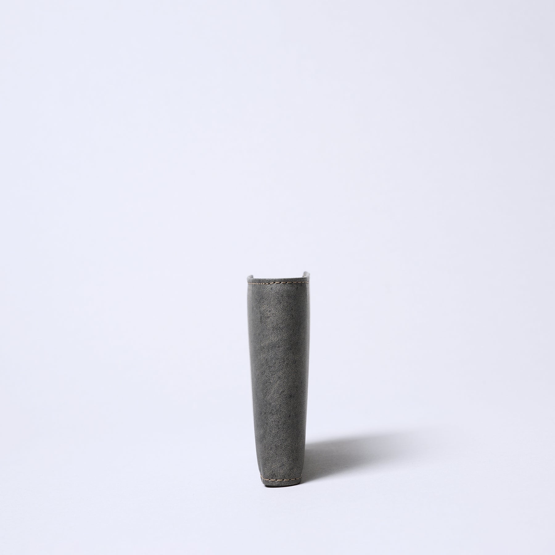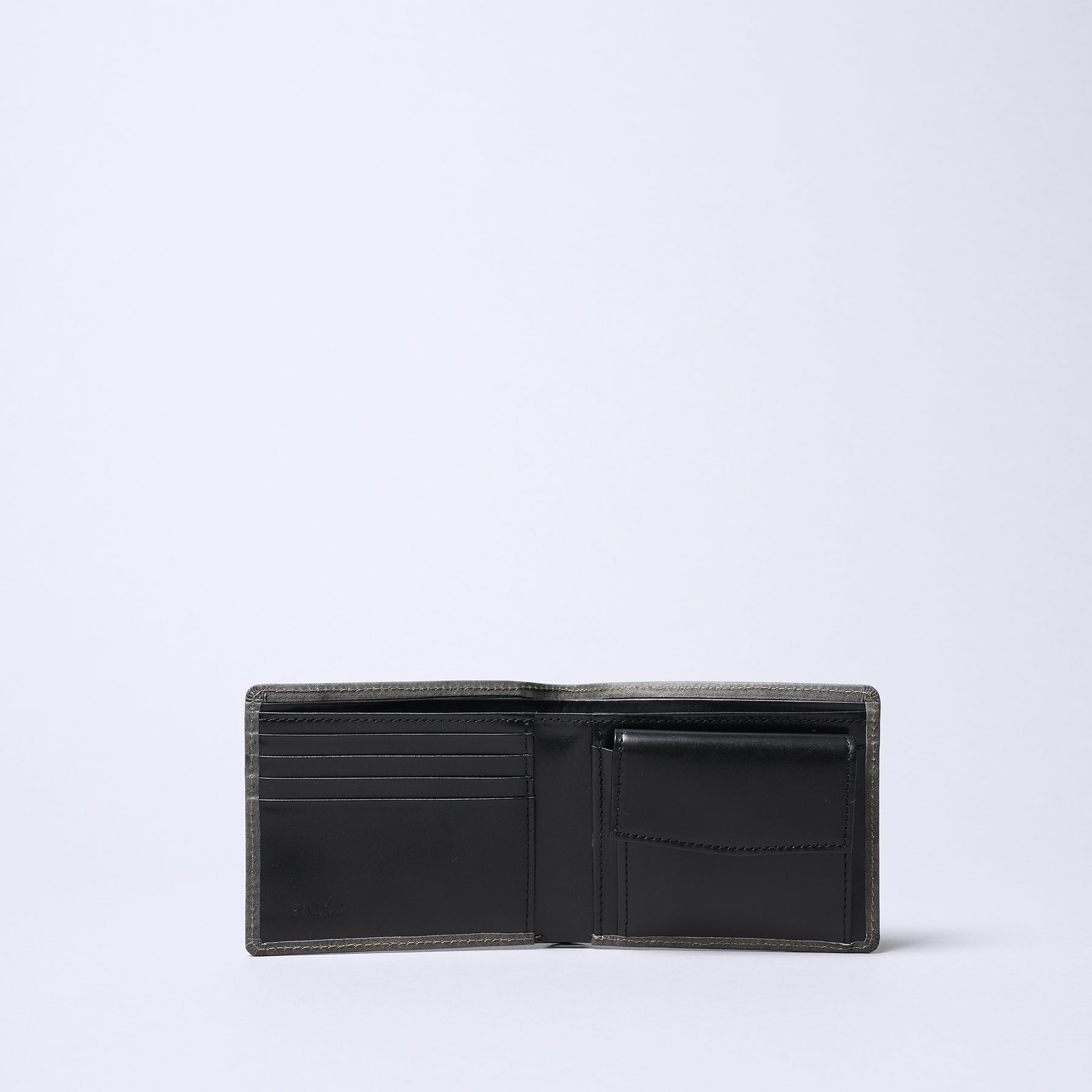 生後6ヶ月から2年程度の仔牛の革であるキップレザーを使用しています。きめ細かく、しっとりとした滑らかな肌触りが特徴で、成牛革に比べると薄手ながらも繊維が密で強度があります。使い込むほどに手に馴染み、美しいエイジング(経年変化)をお楽しみいただけます。その牛革に 日本古来の染色技法である墨染めを施しています。墨の持つ独特の深みのある黒色は、単調な黒色とは一線を画し、奥ゆかしい表情を生み出します。手作業による染色のため、一つひとつ異なる色合いや濃淡が現れ、唯一無二の個性となります。墨の自然な風合いが、革本来の素材感を引き立てます。 コンパクトで持ち運びやすい二つ折りタイプです。ジャケットやパンツのポケットにもスマートに収まります。使いやすさを追求した内装で 紙幣入れ、カードポケット、小銭入れなど、必要な機能をコンパクトにまとめました。日常使いに十分な収納力を備えつつ、無駄のない設計で使いやすさを追求しています。