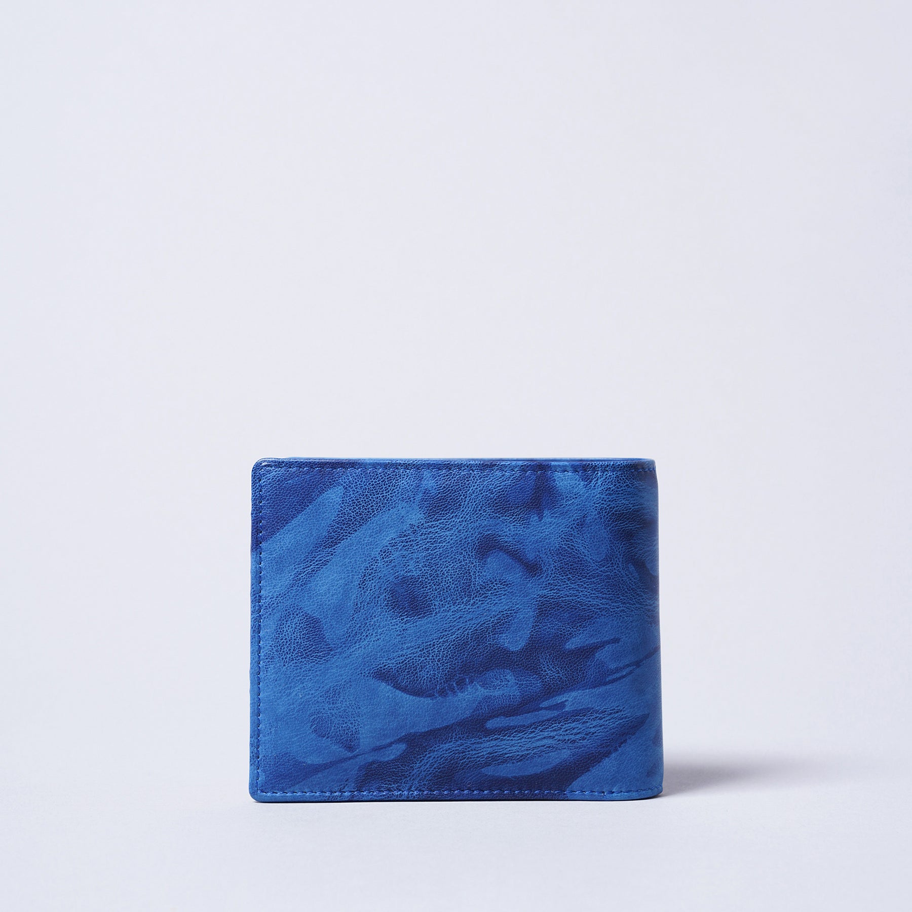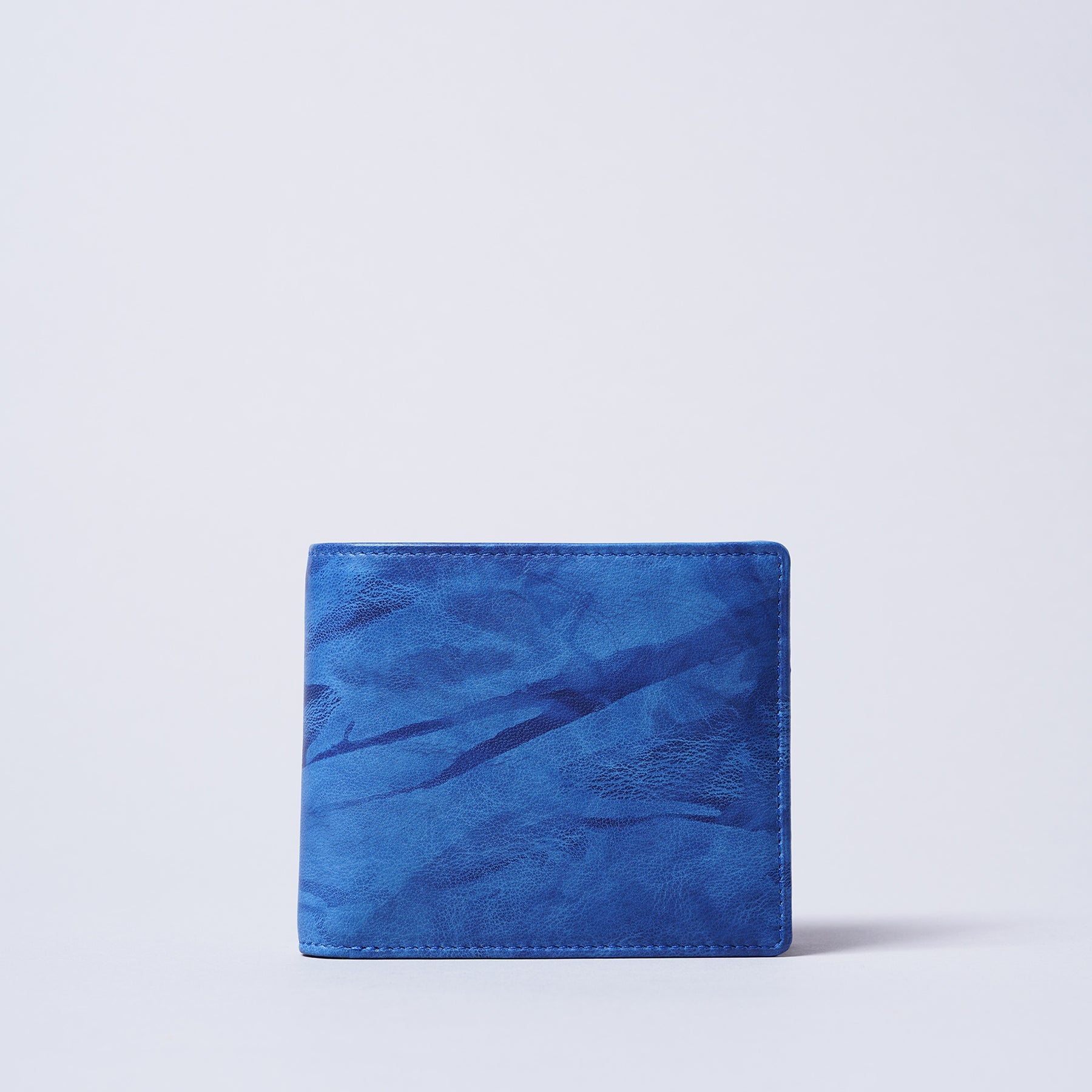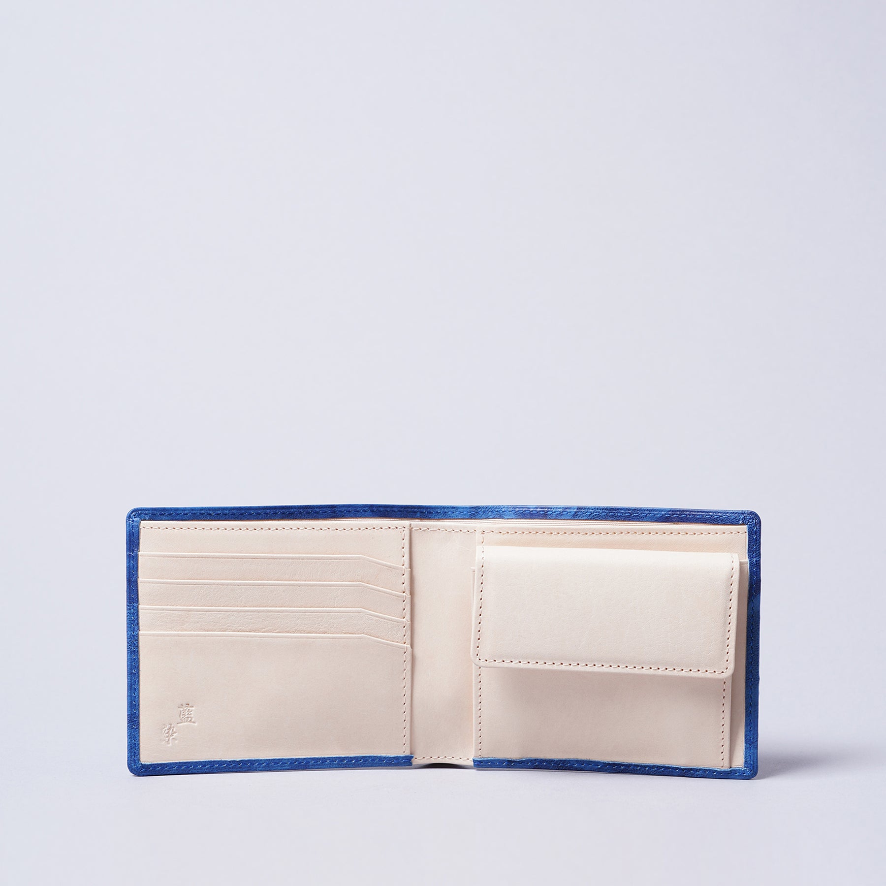 藍染とはタデ科の植物「藍(アイ)」を使った染物。柔らかいシープ革を使い、全て手作業で時間をかけ、手絞りと藍染の樽に漬ける作業を3度繰り返し、日本古来の上品な藍染『ジャパンブルー』が出来ました。手絞りなので模様と色合いはひとつひとつ異なります。小銭が入るベーシックな折財布ですが、お札を分けていれるスペースやカードを入れる場所も多くあり、男性にも女性にも人気の商品です。