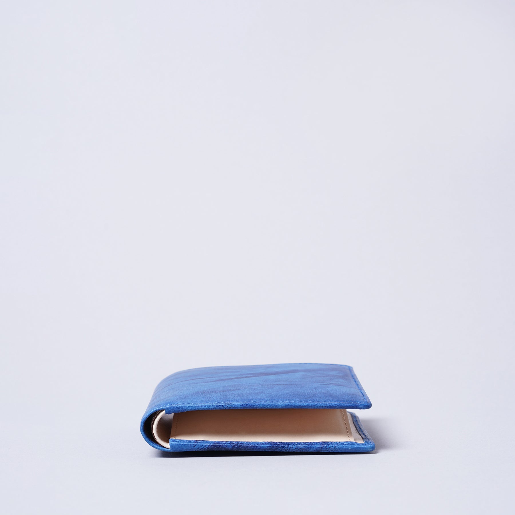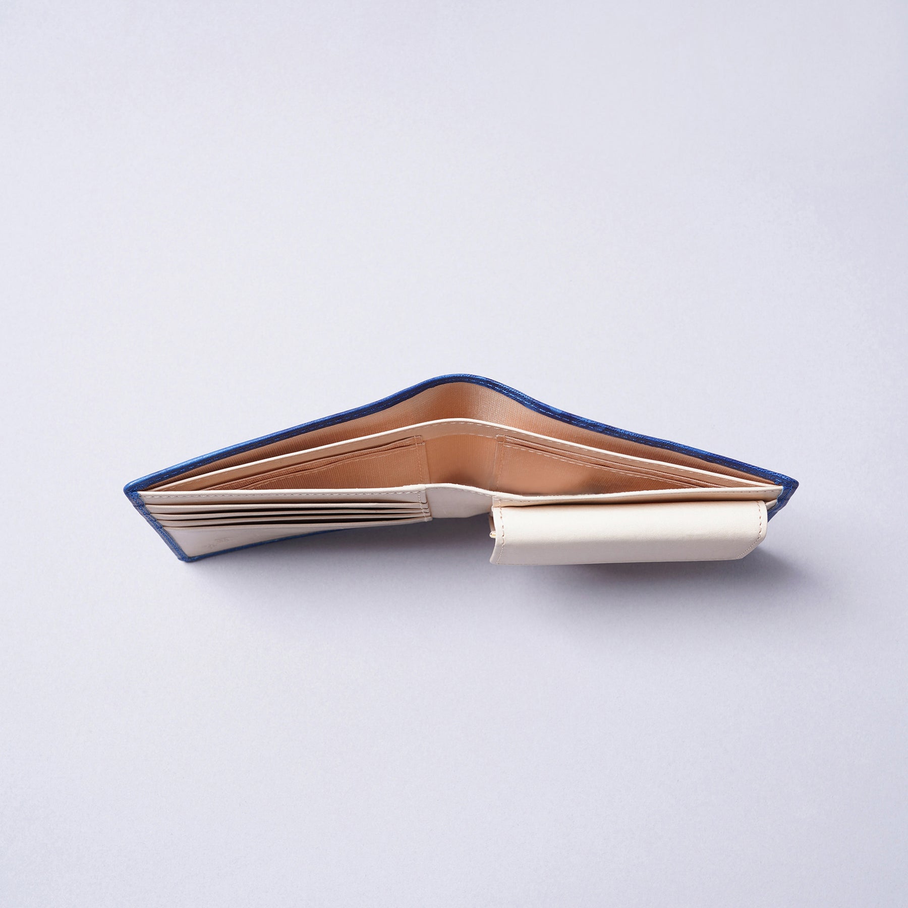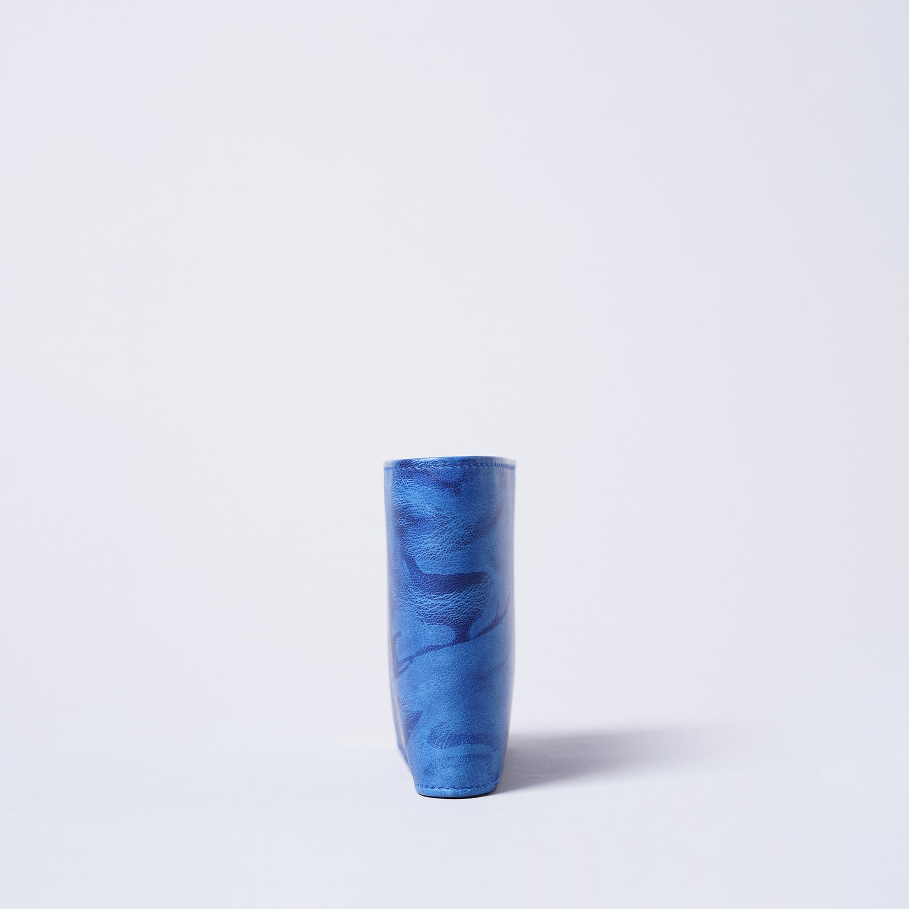 藍染とはタデ科の植物「藍(アイ)」を使った染物。柔らかいシープ革を使い、全て手作業で時間をかけ、手絞りと藍染の樽に漬ける作業を3度繰り返し、日本古来の上品な藍染『ジャパンブルー』が出来ました。手絞りなので模様と色合いはひとつひとつ異なります。小銭が入るベーシックな折財布ですが、お札を分けていれるスペースやカードを入れる場所も多くあり、男性にも女性にも人気の商品です。