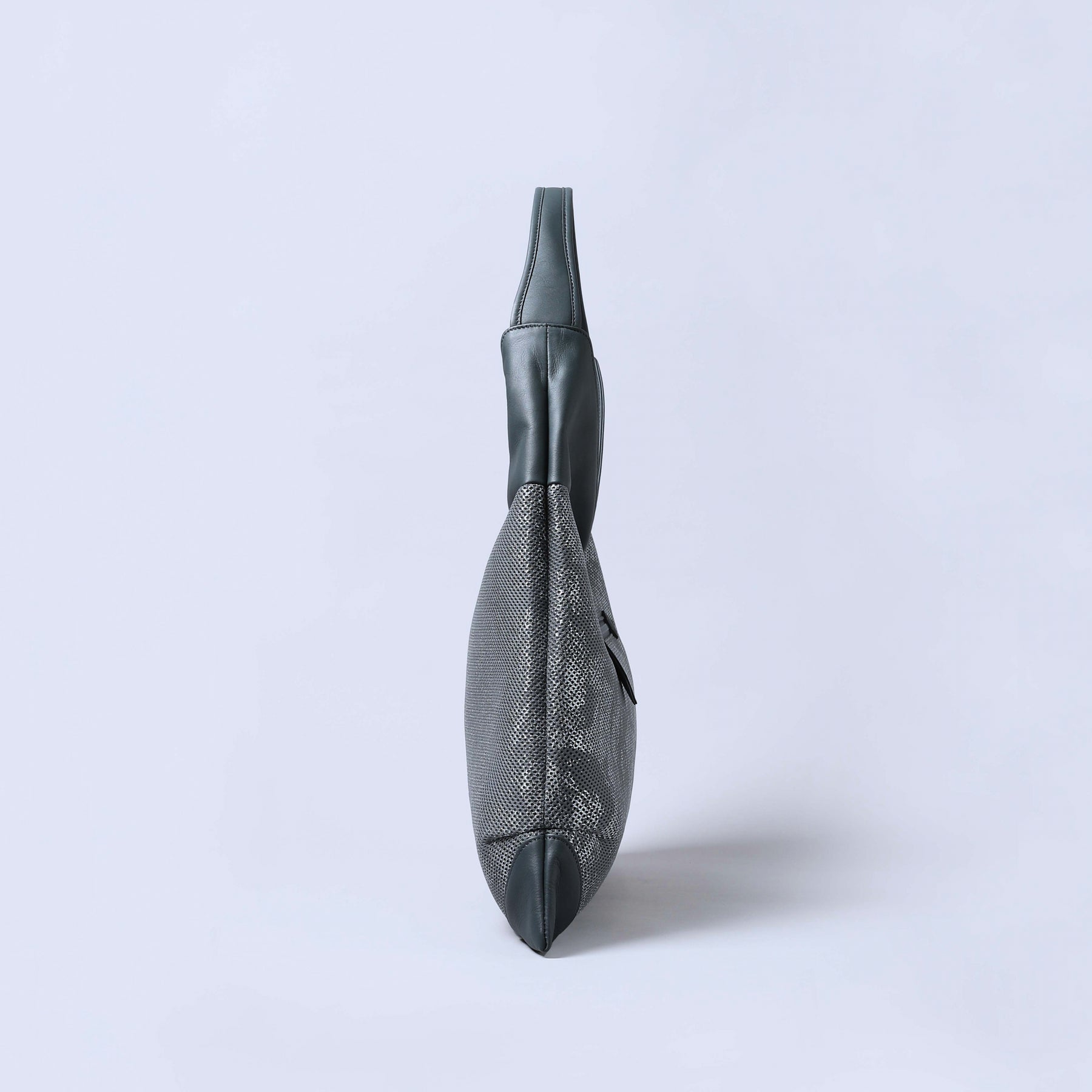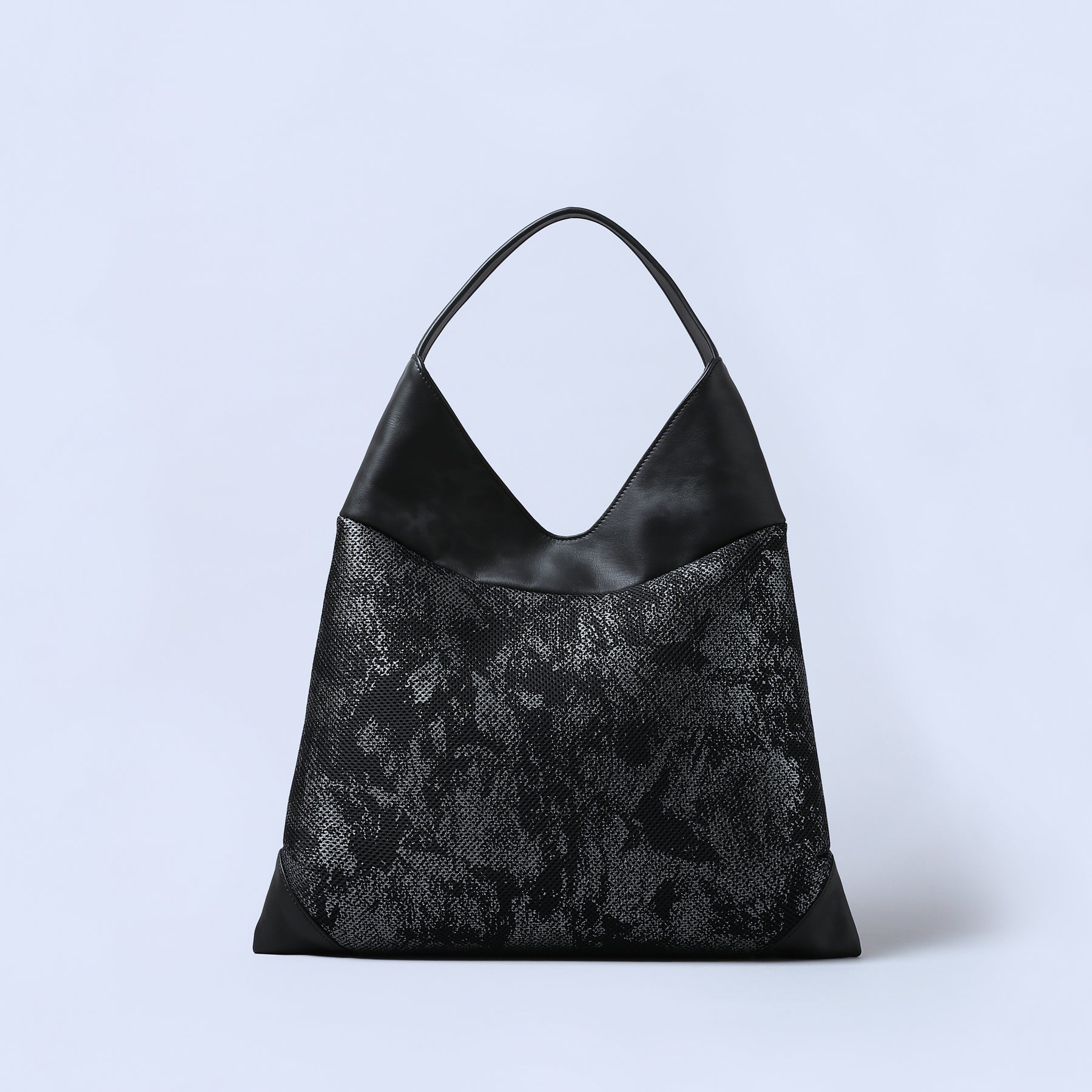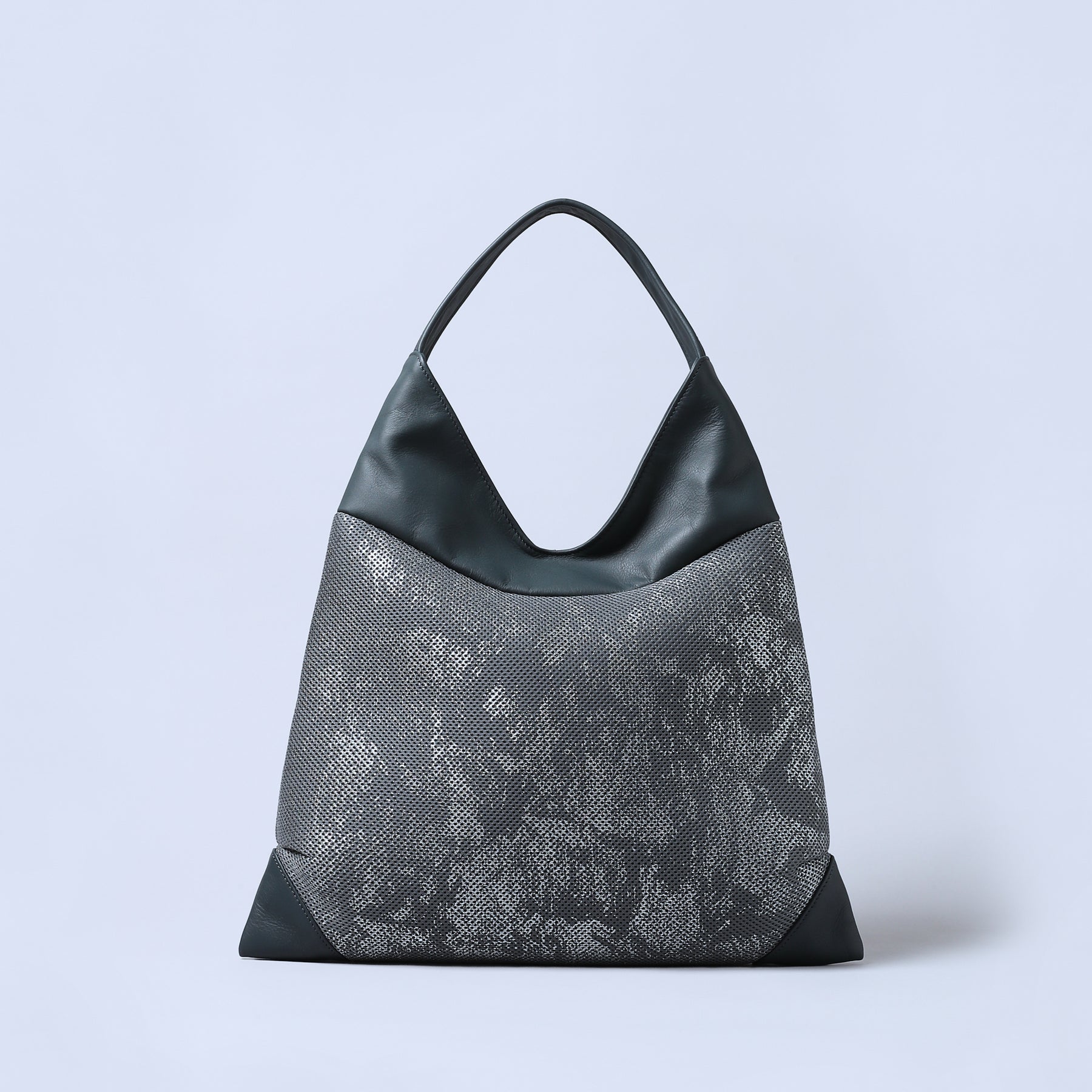 ファッションと親和性の高い軽量異素材コレクション。アートなメタリックのアブストラクト柄がモードな雰囲気。軽いラッセル生地とタッチ感の良いソフトな牛革を使用。ハンドルが心地良く手になじみ辛口モードを和らげる。実用性とファッション性を兼ね備えたバッグは、大人のデイリーパートナーにふさわしい。