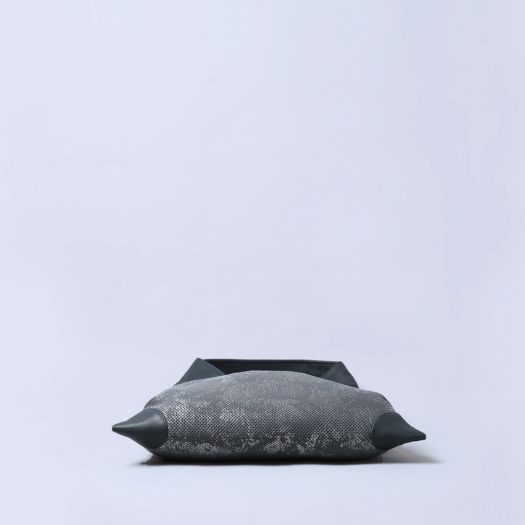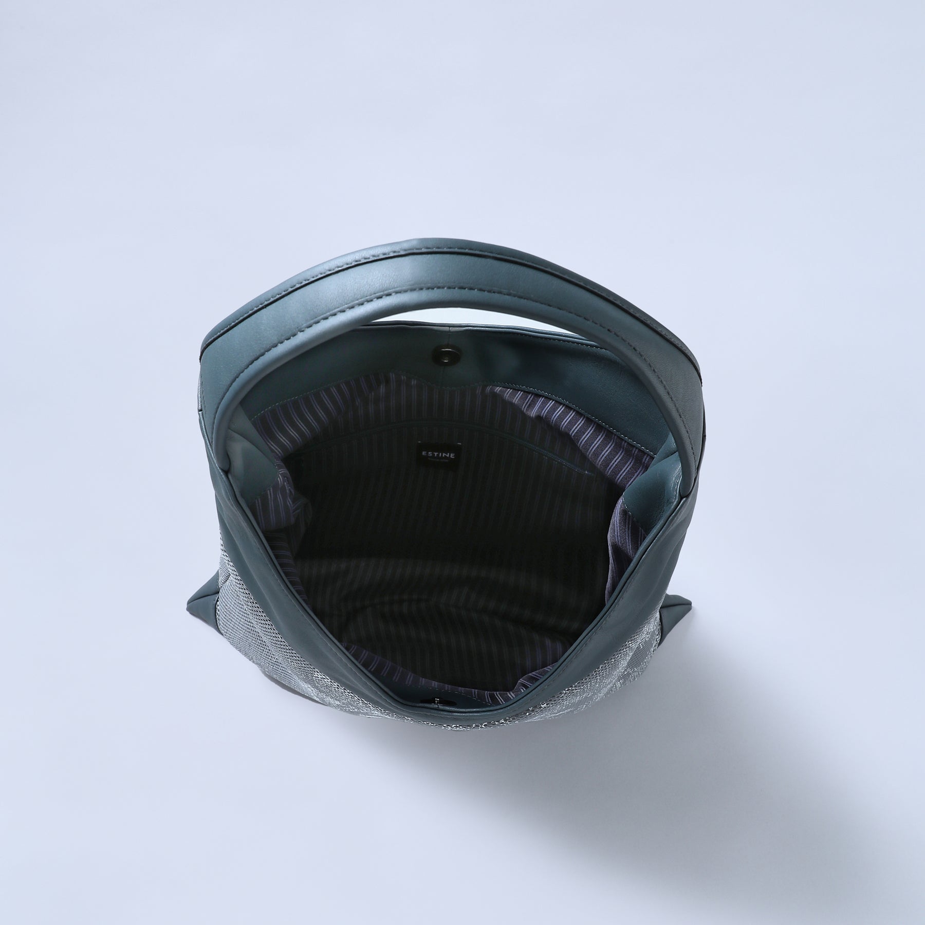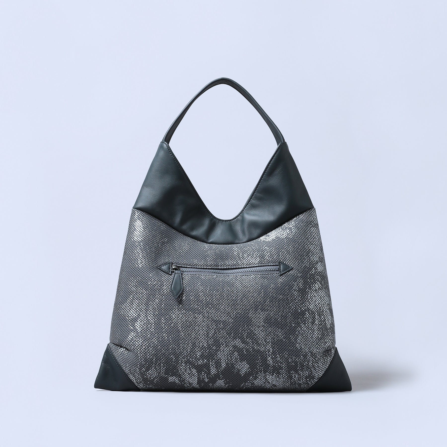 ファッションと親和性の高い軽量異素材コレクション。アートなメタリックのアブストラクト柄がモードな雰囲気。軽いラッセル生地とタッチ感の良いソフトな牛革を使用。ハンドルが心地良く手になじみ辛口モードを和らげる。実用性とファッション性を兼ね備えたバッグは、大人のデイリーパートナーにふさわしい。