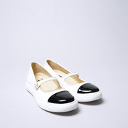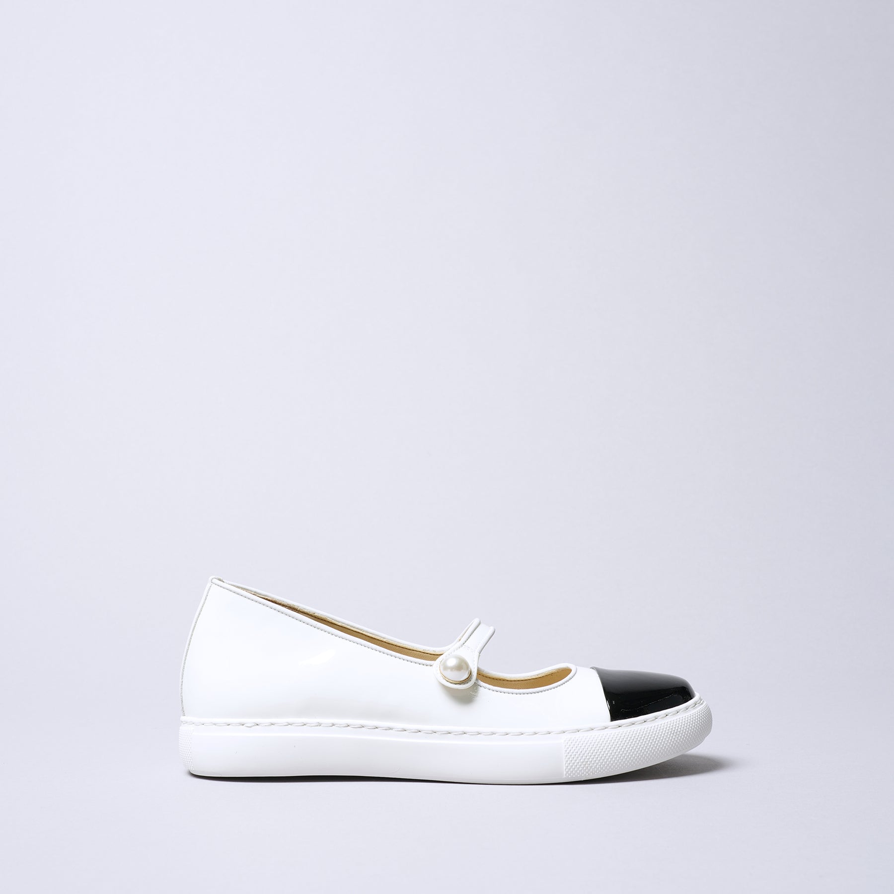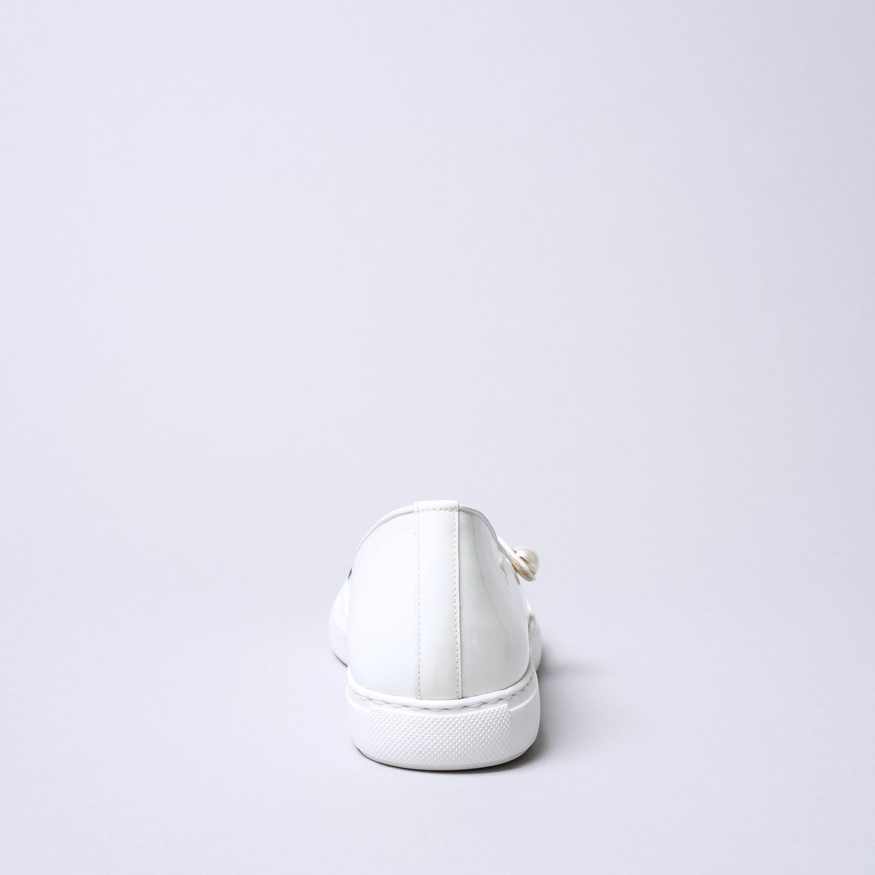 つま先に一文字とストラップにパールの飾りがついたエレガントなスニーカー、ストラップ部分はゴムになっているので、脱げにくく適度に足にフィットします。