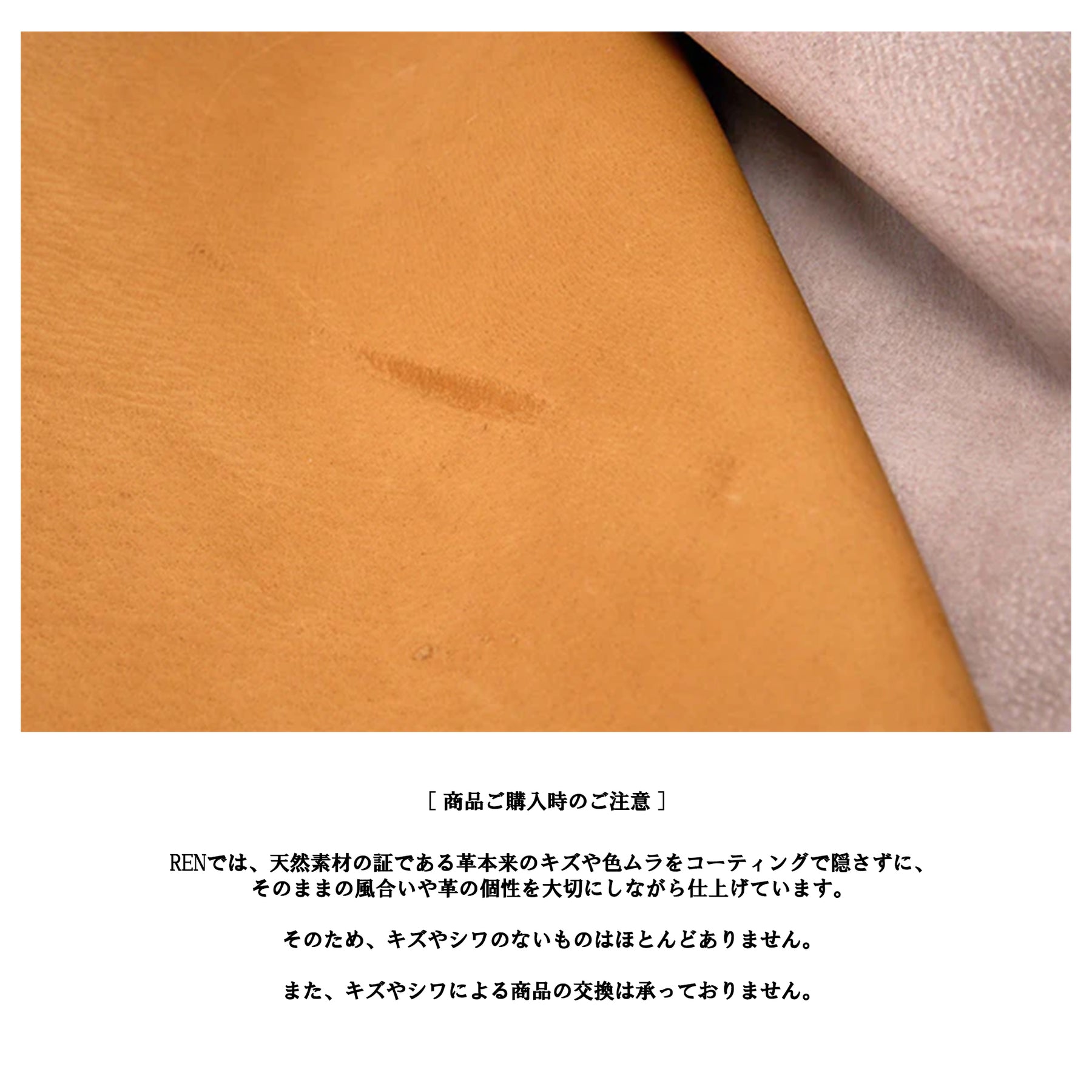 RENでは、天然素材の証である革本来のキズや色ムラをコーティングで隠さずに、そのままの風合いや革の個性を大切にしながら仕上げています。そのため、キズやシワのないものはほとんどありません。また、キズやシワによる商品の交換は承っておりません。