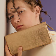 A round zipper long wallet with a box coin pocket in goat leather with an elegant texture that shines in your hand. To maximize the softness of the material, this wallet is sewn with an inside stitch, a testament of the craftsmen’s skill, so that the perforations are not visible from the outside. The unique grain of goat leather is fine and luxurious, soft and supple to the touch. The contrast between the leather-like grain and the metallic finish makes for a beautiful wallet.