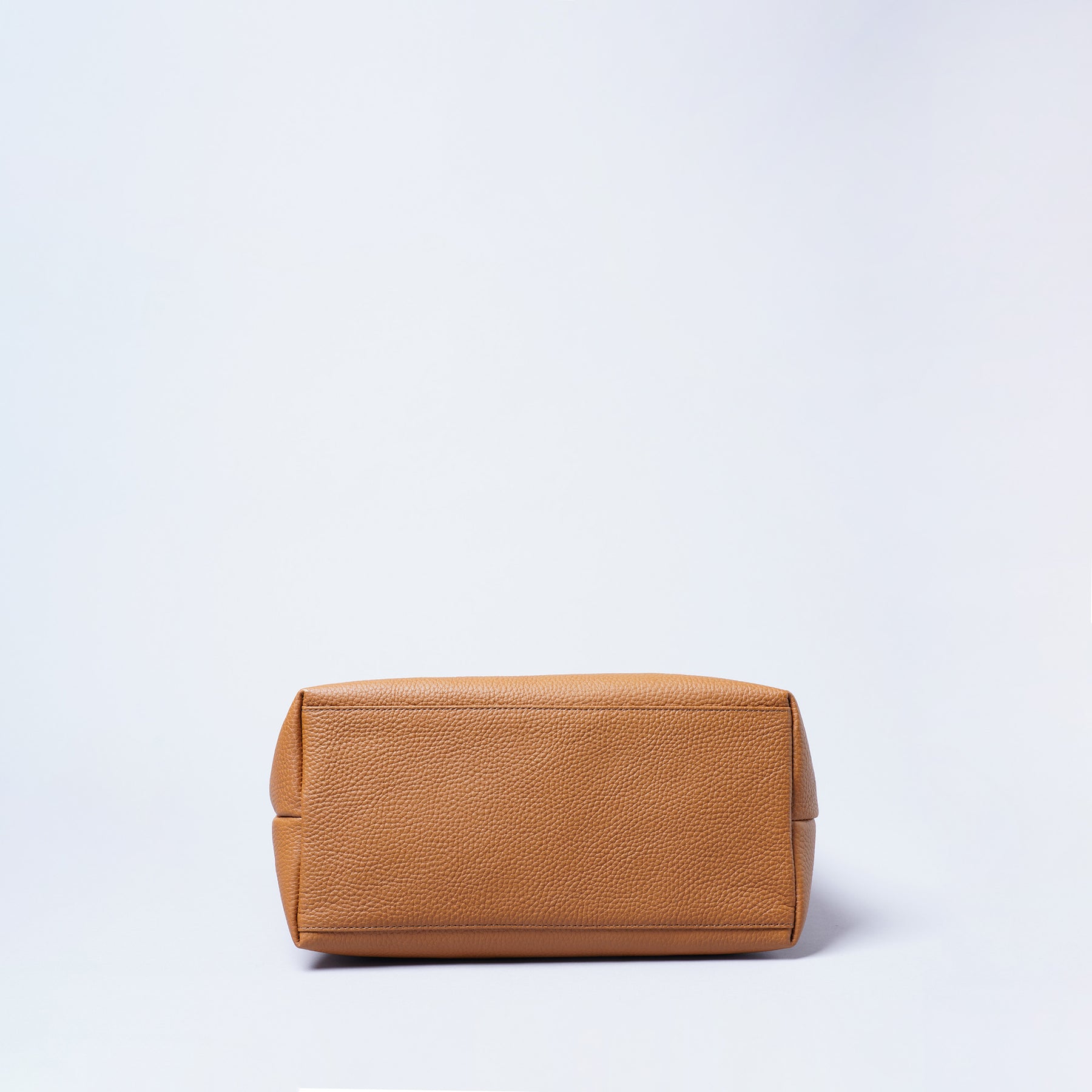 This tote bag is made of thick grained leather that can hold A4 size documents horizontally. The body is made of a luxurious single piece of leather, which is rare for this size, giving it a very special and luxurious feel. The handle, bottom, opening, and all other parts of the bag have turned edge giving it a fluffy form. The four-layered handle is carefully selected for its length and thickness to ensure a comfortable fit when held in the hand. The opening has a top gusset so that it cannot be seen from the outside, and a hook closure instead of the usual zipper makes access easier and less time-consuming. Despite the use of so much leather, it weighs only about 900g, making it very lightweight. It is suitable for both men and women.