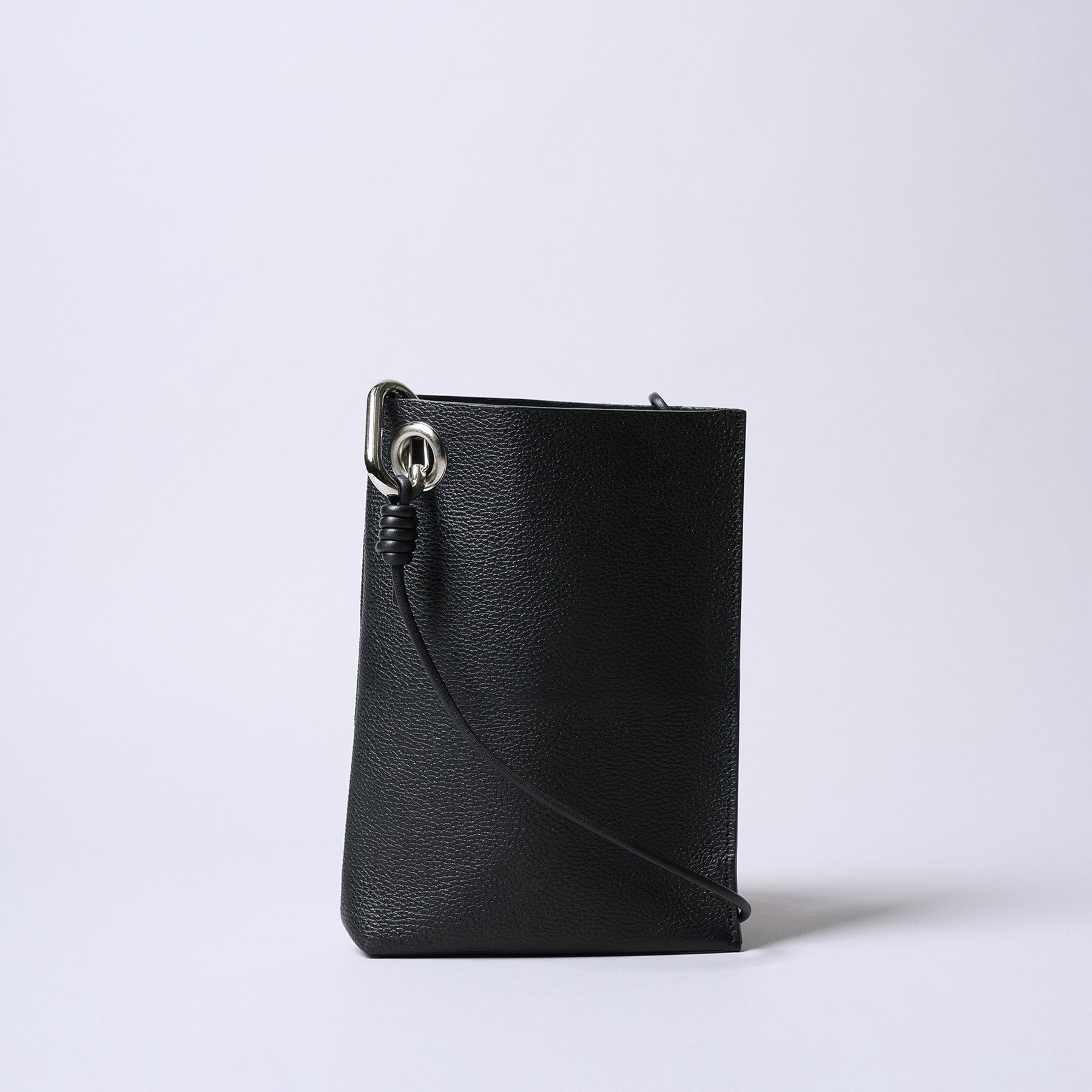 ■A minimalist mini shoulder bag featuring industrial metal hardware, with one side featuring gussets and the other side without, creating an asymmetrical shape that appears simple yet is packed with thoughtful details