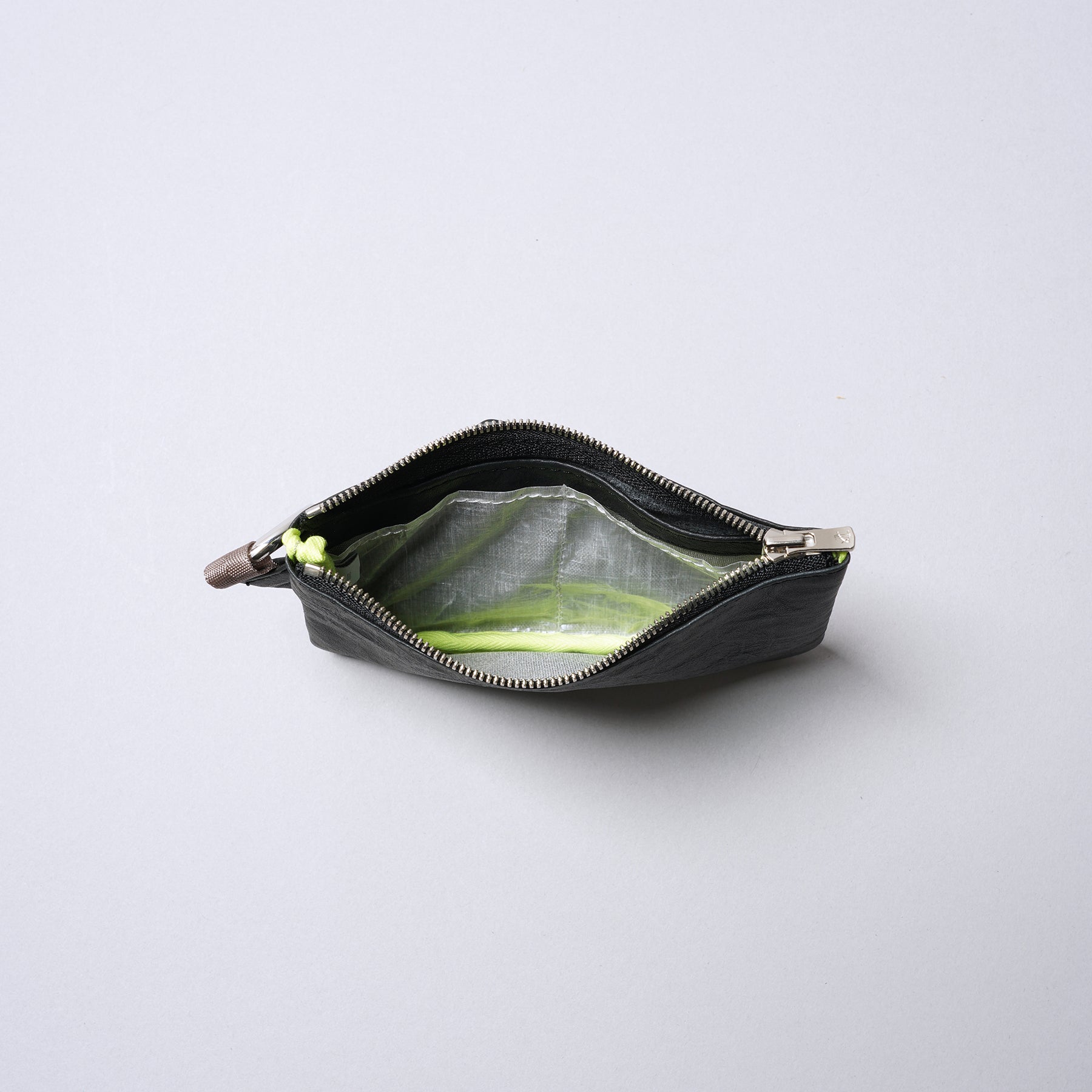 A pouch crafted from Dyneema® leather. The interior pocket utilizes Dyneema® Composite Fabric and CORDURA® fabric. The partially incorporated translucent white film material (Dyneema® Composite Fabric) is accented with fluorescent yellow piping tape that stands out against the monochrome palette, creating a pop finish that contrasts with the exterior's subdued look. Equipped with a ring clip, it can be used alone, attached to other bags, or worn using belt loops. Pairing it with the separately sold nylon strap or multi-cord allows for customization into a minimal-sized bag, further expanding its uses. Designed with wearability in mind, this item fully leverages the lightweight benefits of Dyneema® leather. Weight: 46g Inside: Side pockets x2, Card pockets x2 Examples: earbuds, tablet, cars, coins, bills etc.