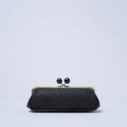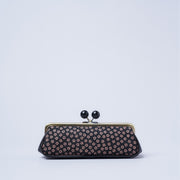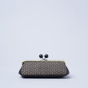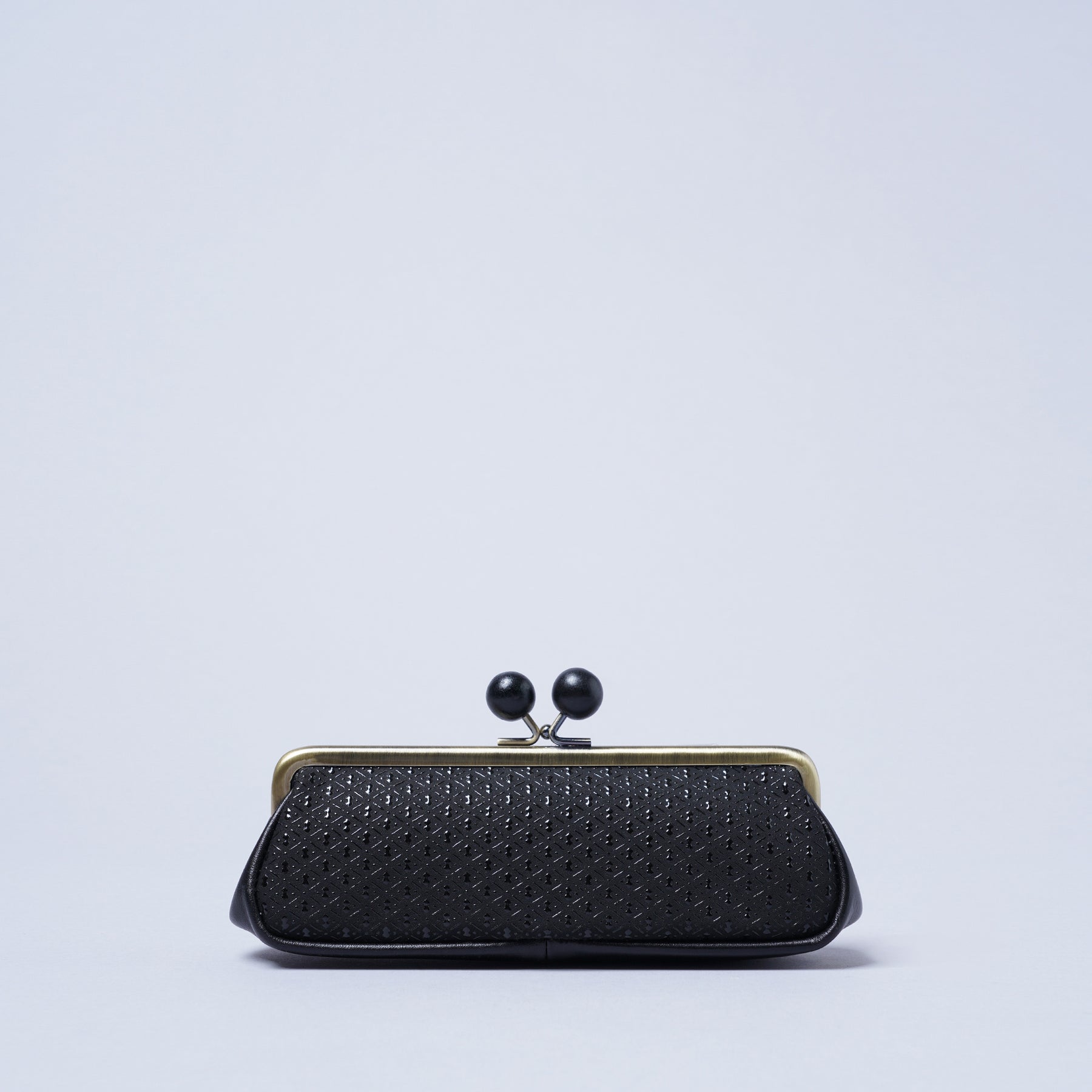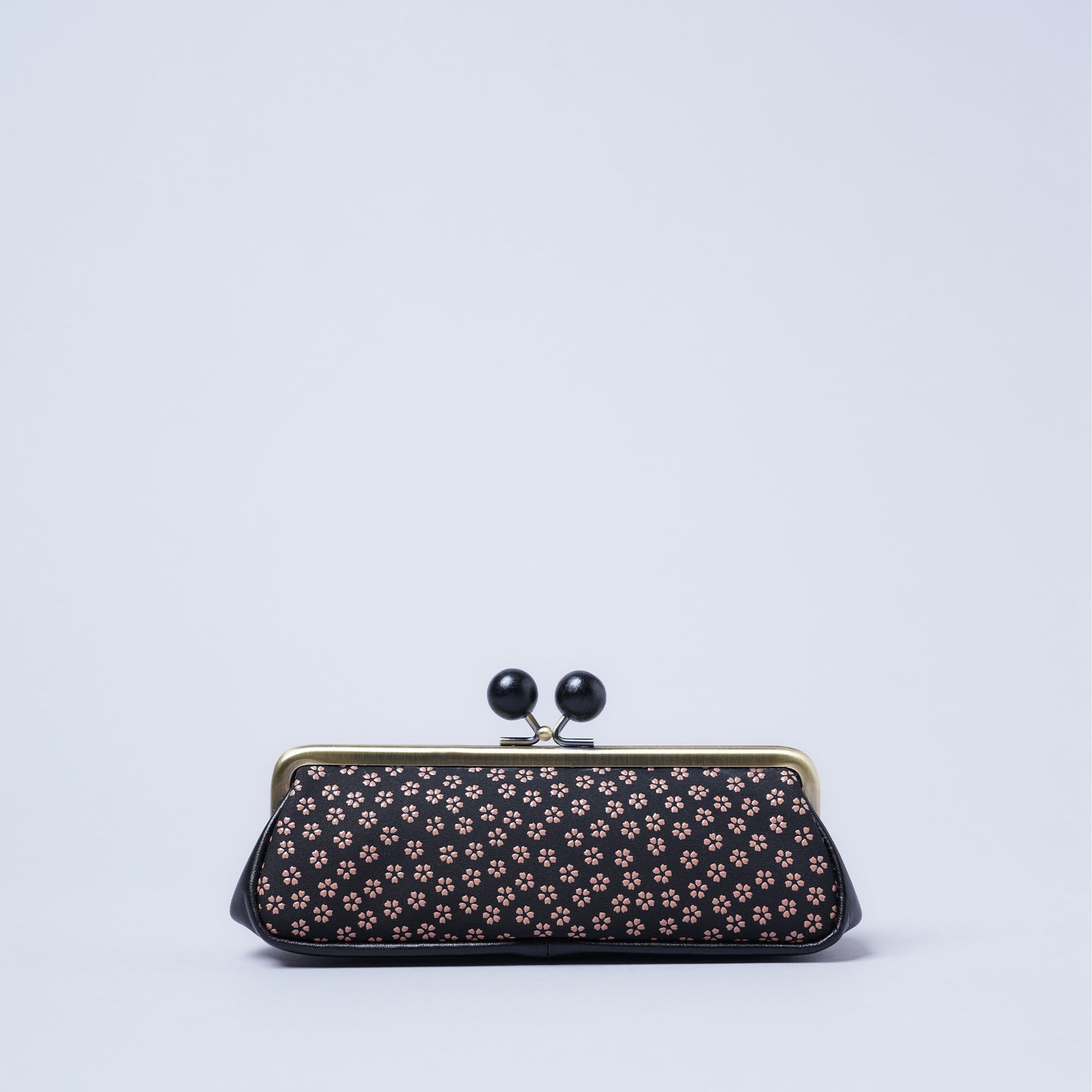 本シリーズでは木製で大きめのらっきょう玉と真鍮色の金具が上品なバランスで仕立てられたがま口を使用しています。らっきょう玉は大きいながらも軽いものを使用しているので全体の重みには影響しないのが嬉しいポイント。深い色味と木目仕様が和風をさらに演出したアクセントになっています。