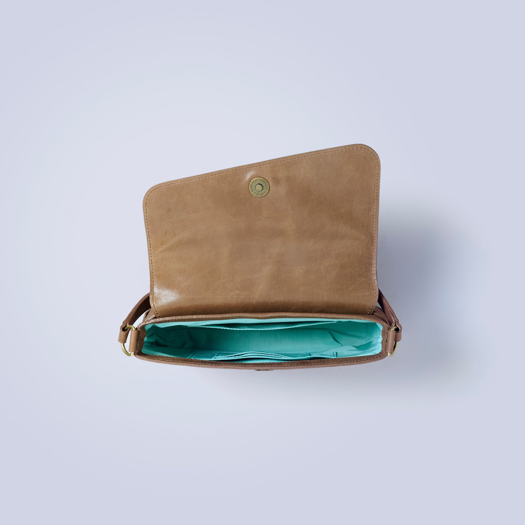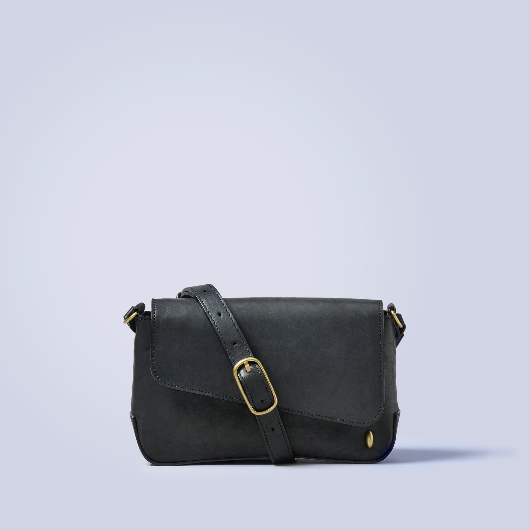 シンプルなショルダーバッグ。斜めにカットされたマグネット付きフラップがユニークなデザイン。