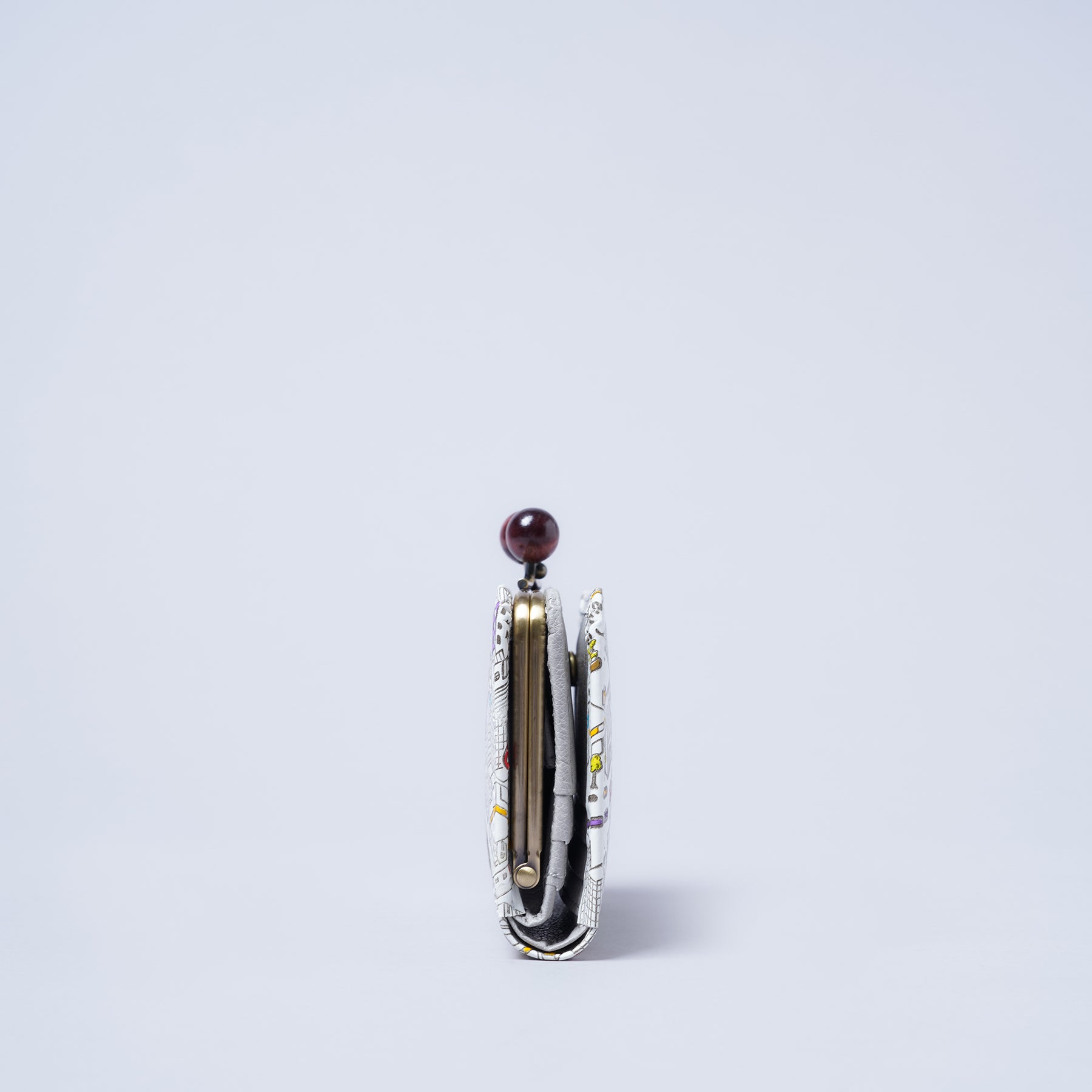 財布シリーズ含む4型に付属しているがま口。木製で大きめのらっきょう玉と真鍮色の金具が上品なバランスで仕立てられています。らっきょう玉は大きいながらも軽いものを使用しているので全体の重みには影響しないのが嬉しいポイント。深い色味と柔らかな木目が和のテイストを演出するアクセントになっています。