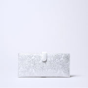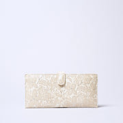 Made with delicate Italian embossed leather featuring a pearl finish. A feminine, elegant material. Crafted with care by Japanese artisans. Despite its very slim design, it can hold bills, cards, and coins.