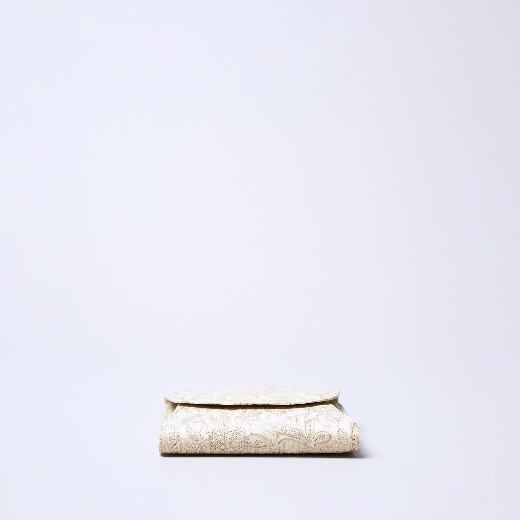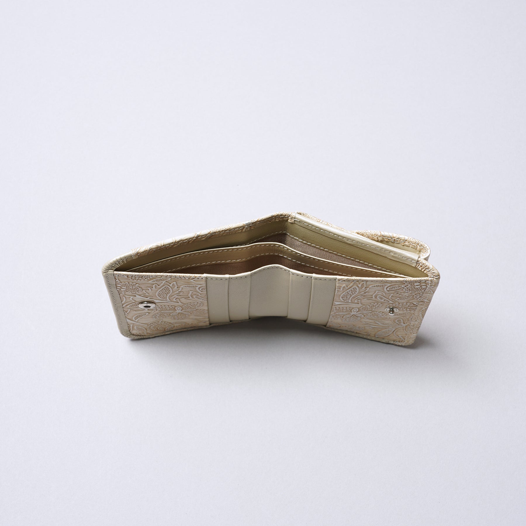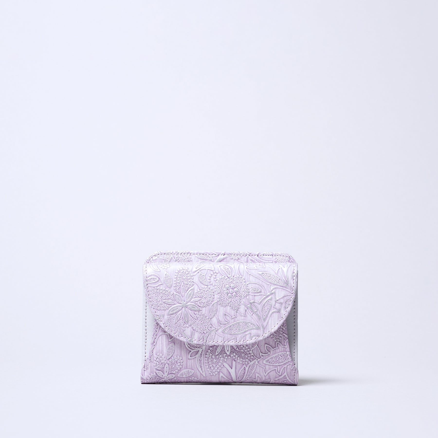 Made with delicate Italian embossed leather featuring a pearl finish. A feminine, elegant material. Crafted with care by Japanese artisans. Compact bifold wallet. The exterior coin pocket is box-style for easy visibility and access.