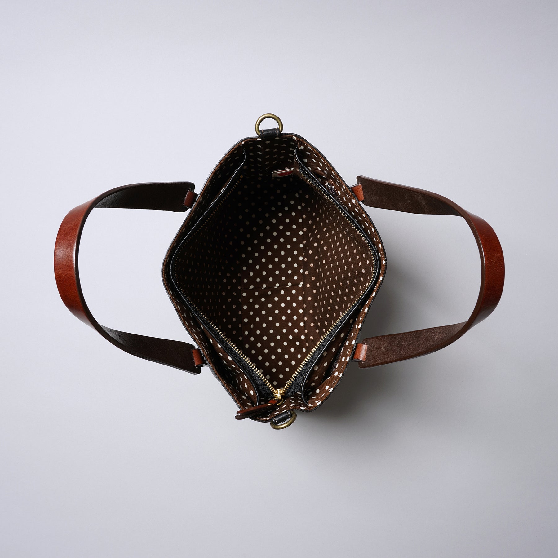 This long-selling series features expressive cowhide with a subtle grain pattern, accented with vegetable-tanned leather components. The polka dot lining visible through the top opening is another signature detail. The shoulder strap, crafted from the same leather, is detachable. Crafted from material that ages beautifully, it develops a softer, more attractive patina the more it's used.