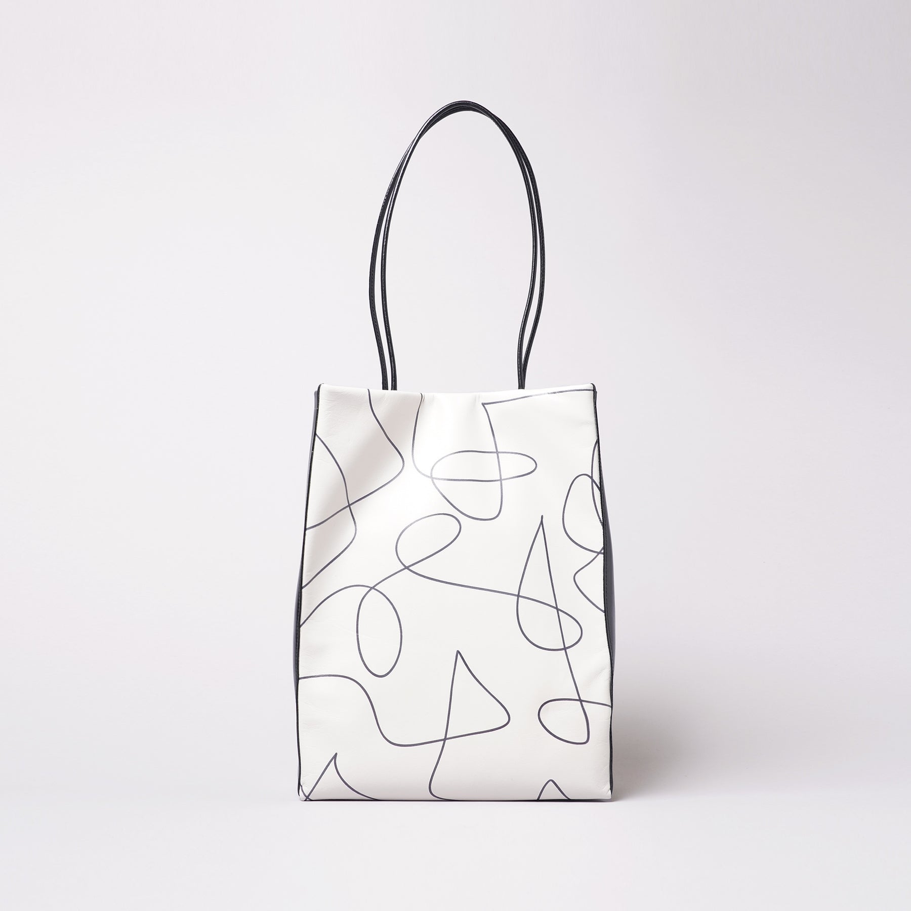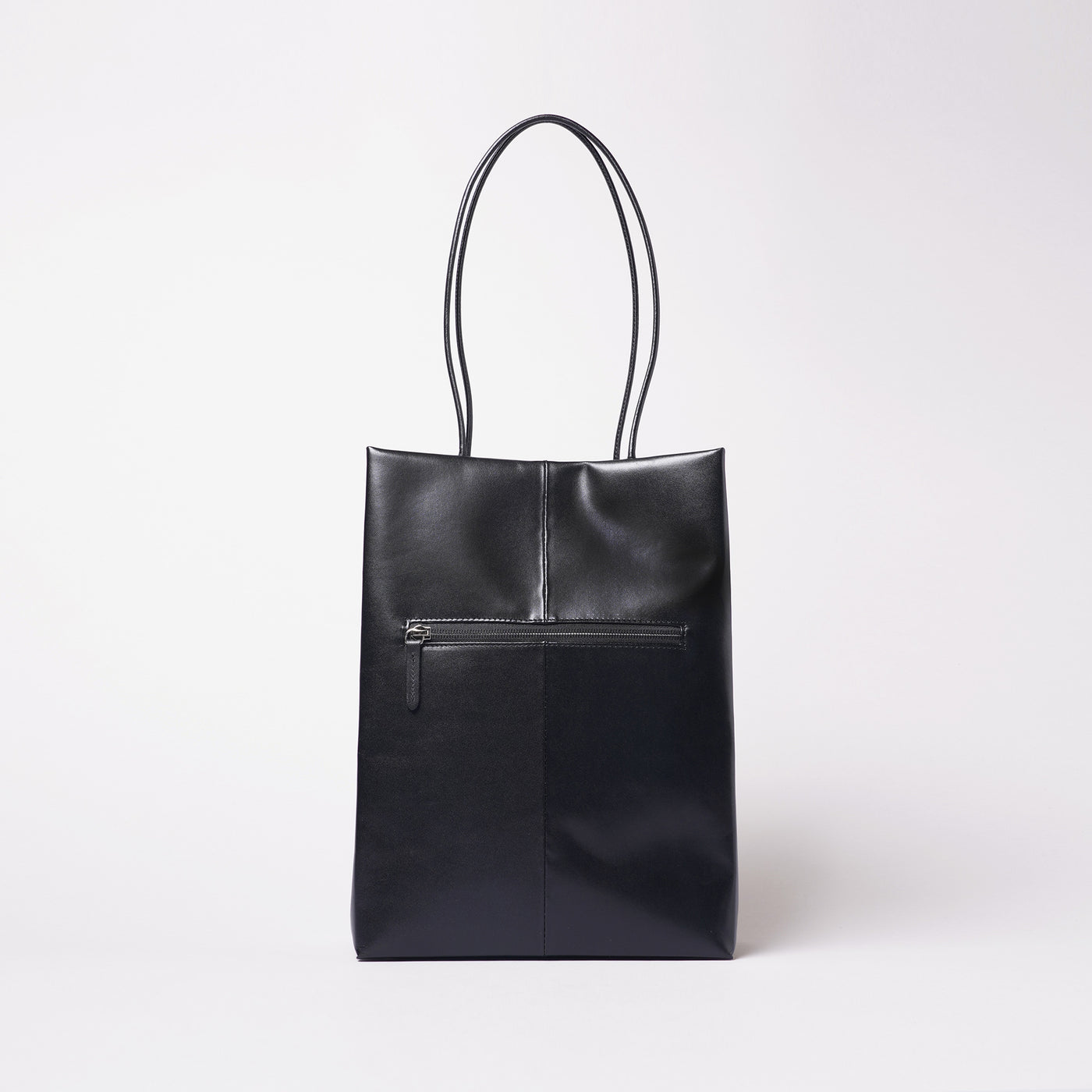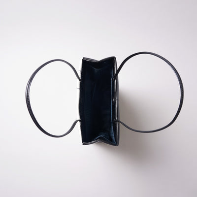 A minimalist cowhide bag with a paper bag motif. The stitching is kept to a minimum, creating a clean look that accentuates the beauty of the form. The solid black color adds class to your styling. The sides of the bag are made using a technique called "grooving," and the craftsmanship shines through everywhere in this item. A simple form that neatly fits an A4-size document. The handle is long enough to carry on your shoulder even when wearing a thicker coat. It is useful for business or when you have a lot of luggage. Opening and Closing: Magnetic