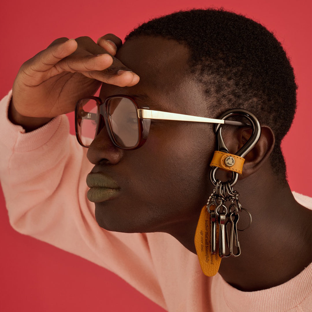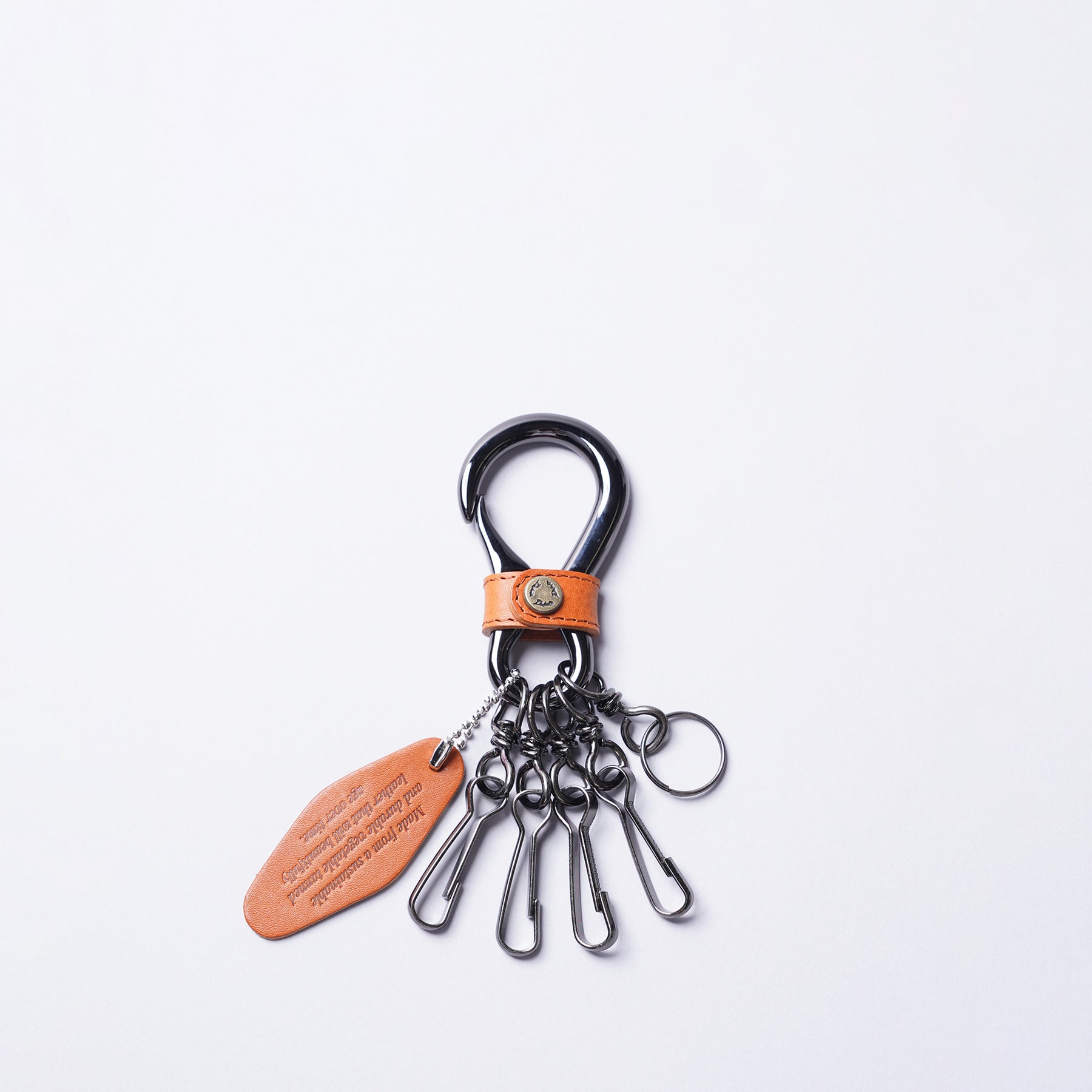 採用義大利產牛皮製作的鑰匙環系列。此款鑰匙環選用的鮮豔多彩義大利皮革由皮革職人細緻縫製,並與具有份量感的金屬釦環搭配,將一般給予人較單調印象的鑰匙環,因搭配義大利皮革而添增設計感,使鑰匙環也可化身為時尚配件。這款使用黑色鍍鎳製作勾環的時尚鑰匙環,選用具有分量感的金屬配件,可用鉤環順暢放入或取下鑰匙,鑰匙環上附有四個鑰匙勾環、1個鑰匙圈,共可隨身攜帶五把鑰匙出門。