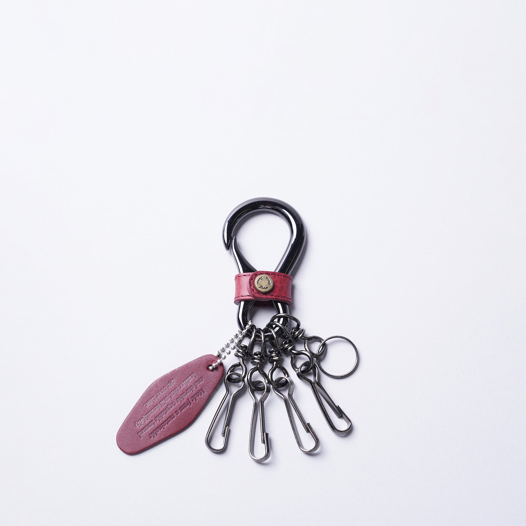 採用義大利產牛皮製作的鑰匙環系列。此款鑰匙環選用的鮮豔多彩義大利皮革由皮革職人細緻縫製,並與具有份量感的金屬釦環搭配,將一般給予人較單調印象的鑰匙環,因搭配義大利皮革而添增設計感,使鑰匙環也可化身為時尚配件。這款使用黑色鍍鎳製作勾環的時尚鑰匙環,選用具有分量感的金屬配件,可用鉤環順暢放入或取下鑰匙,鑰匙環上附有四個鑰匙勾環、1個鑰匙圈,共可隨身攜帶五把鑰匙出門。