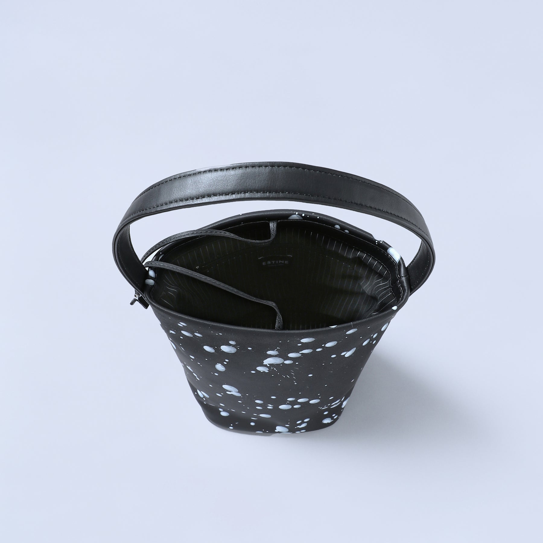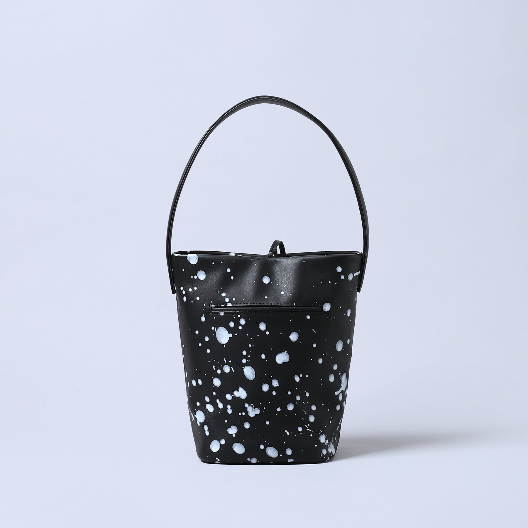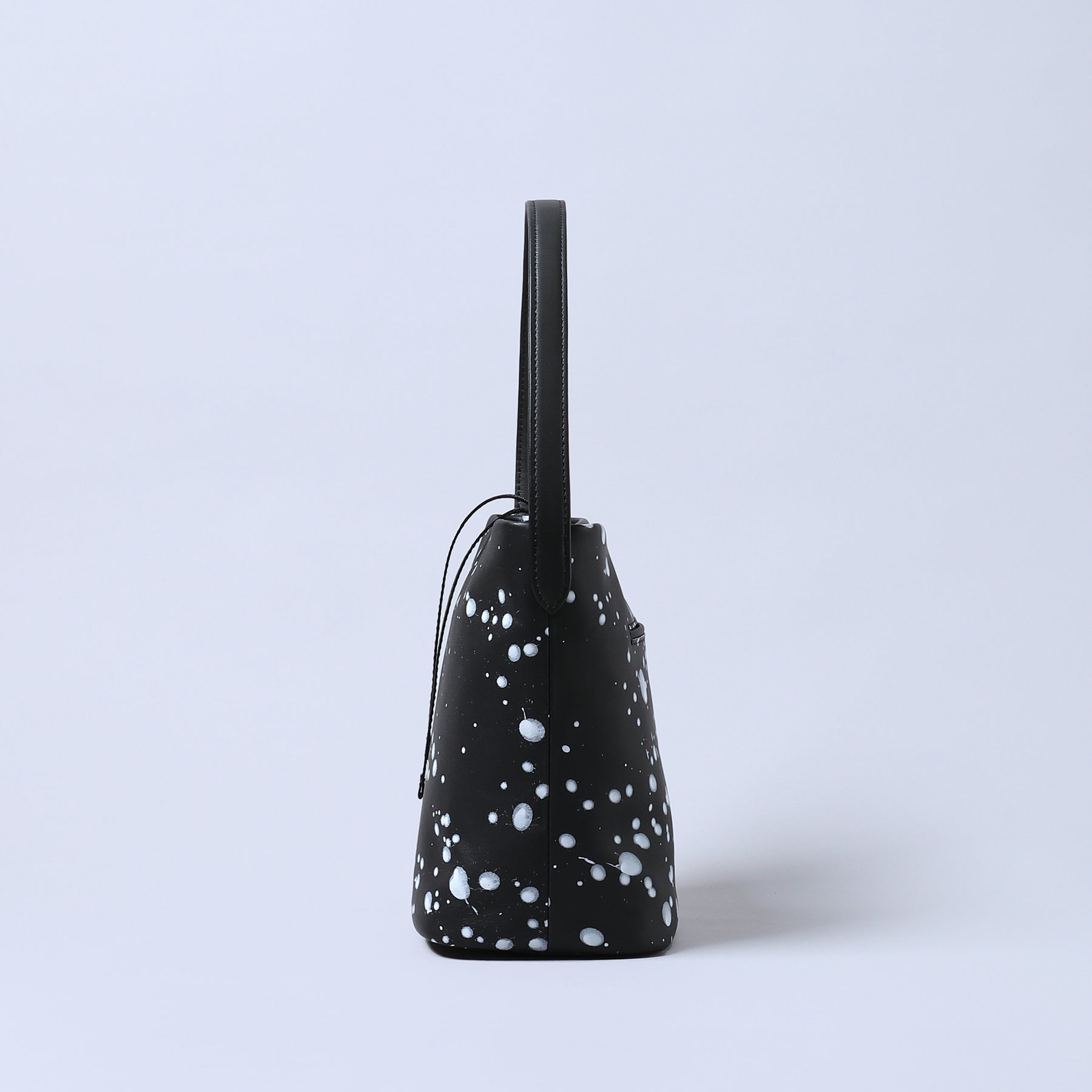 此款手提包在漆黑的光滑皮革上施予白色濺鍍塗漆,偶然形成的抽象軌跡,刻畫出獨一無二的圖案。皮革上的塗漆在包包越加使用後將會逐漸產生裂紋,與材質相互呼應,色澤將更為深邃。藝術與時尚交錯的前衛造型吸引目光,為整體造型增添自信感。