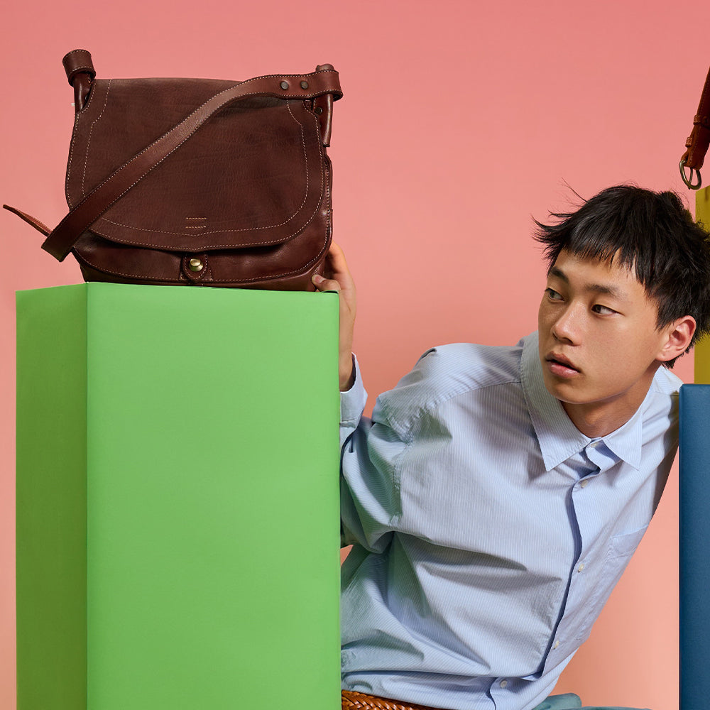 這款斜肩包採用後染皮革製作,色澤質地濃厚。每款包包的色調深淺及光澤感皆有所不同,獨特的復古風格,獨一無二。