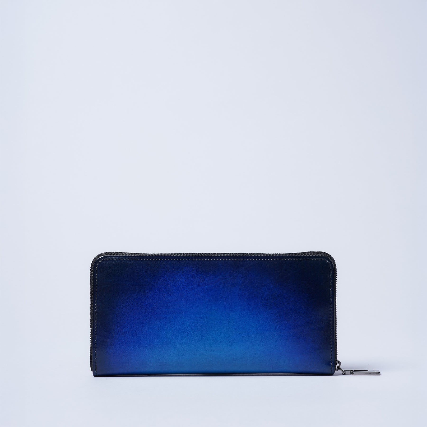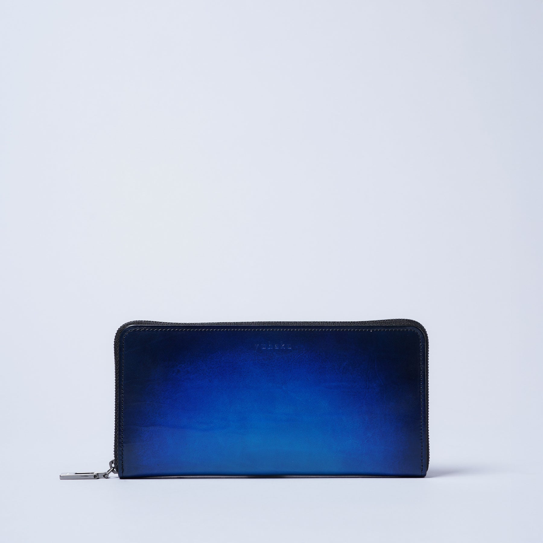 此款長夾來自Veratula系列,以繪畫技法為設計靈感。透過yuhaku品牌的獨家招牌染色技術,使皮革呈現出兼具透明感與深邃感的漸層美麗效果。在細緻的小牛皮上由yuhaku染色職人施予手染處理,使原本不透明的皮革呈現出極具透明度的漂亮光澤。這項由yuhaku獨創出的手染技藝源自繪畫技巧,也是全球罕見的稀有技術。